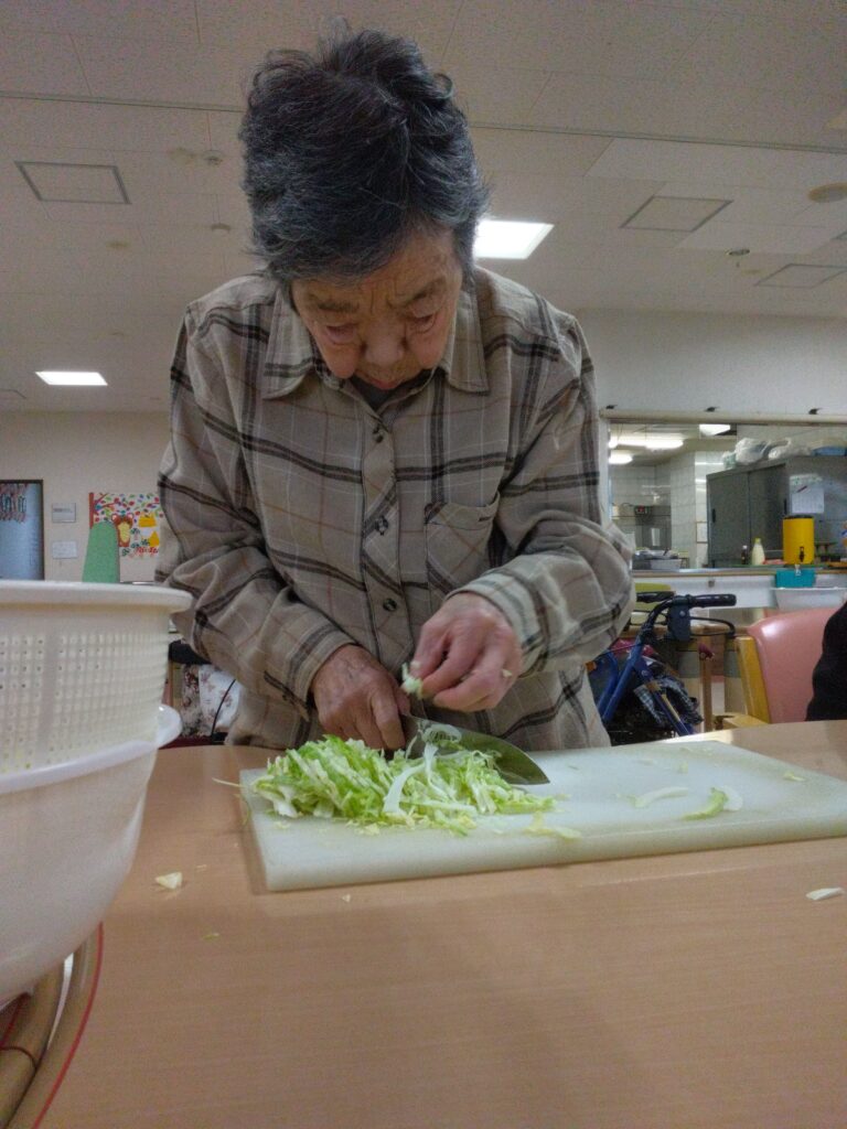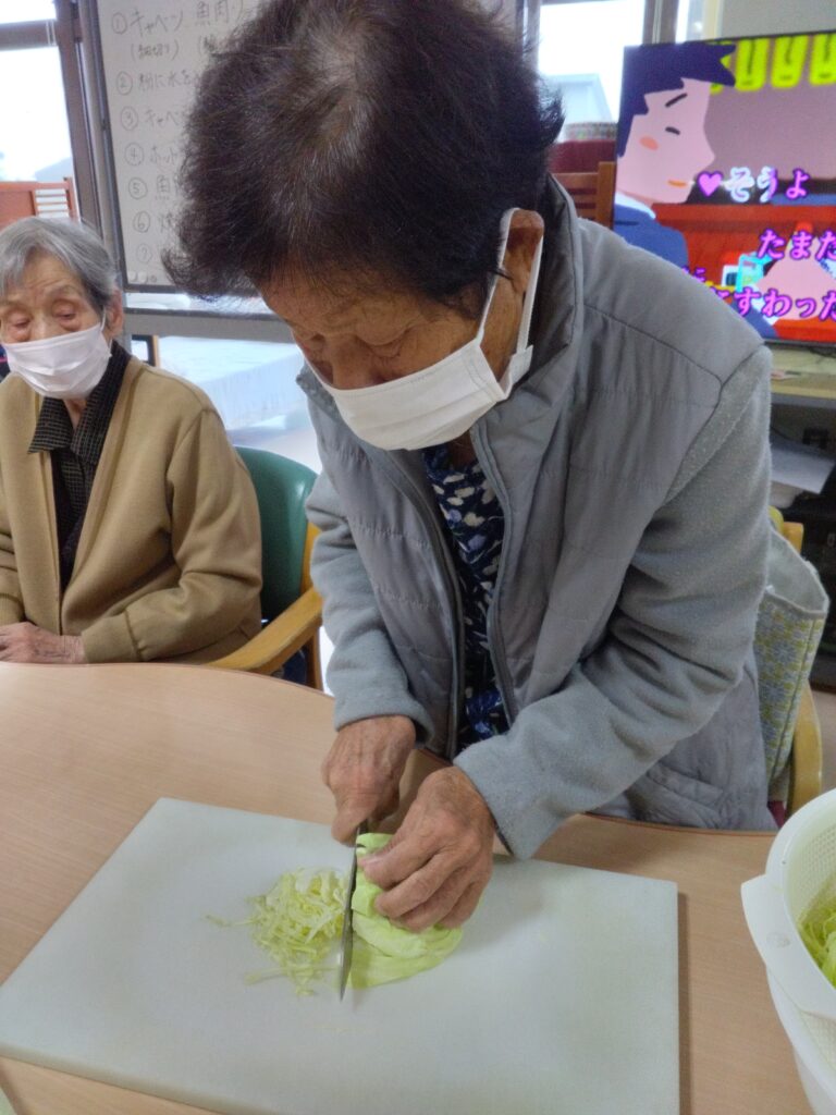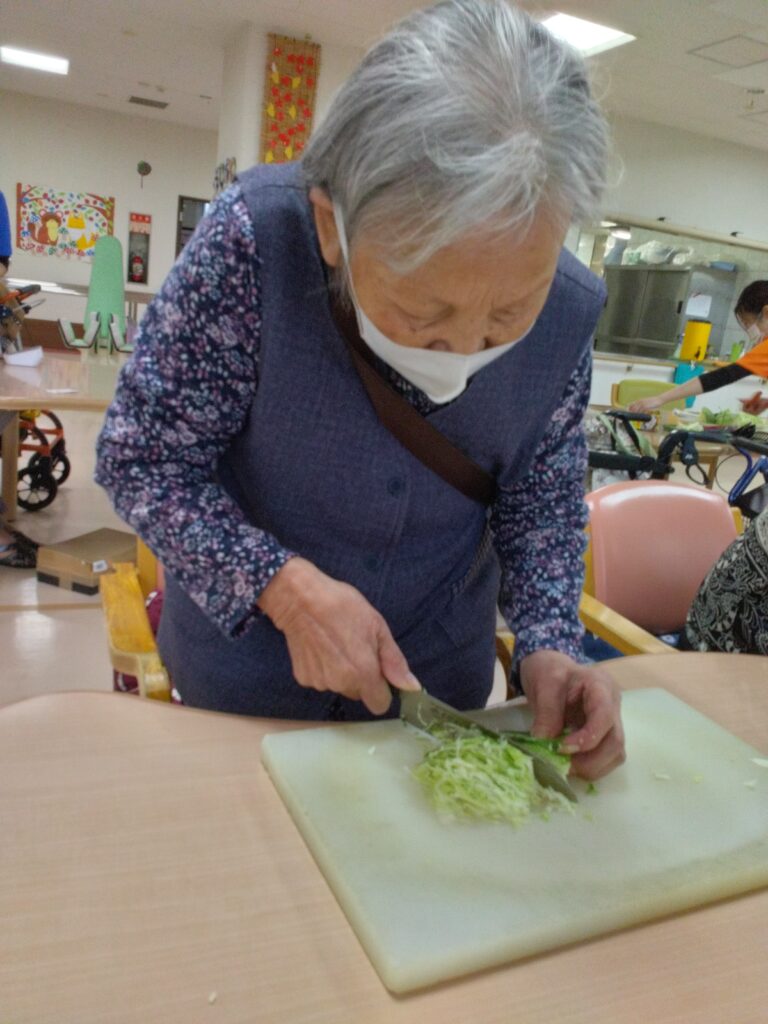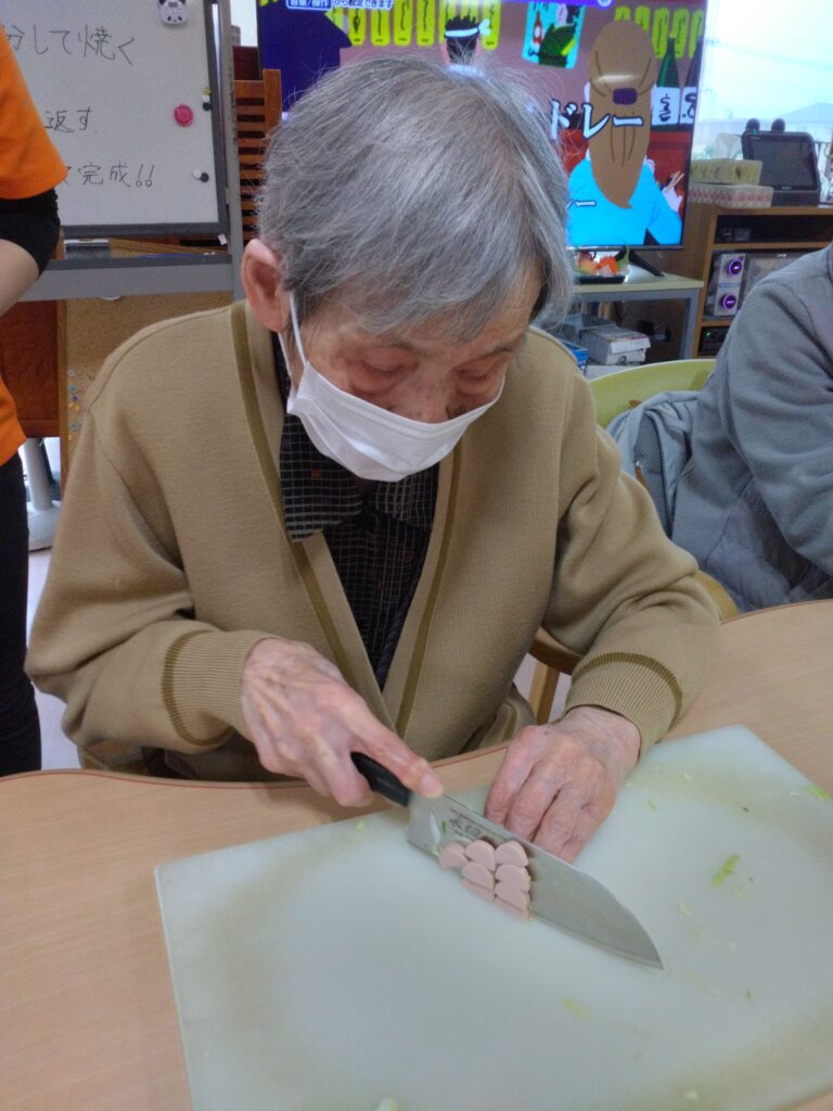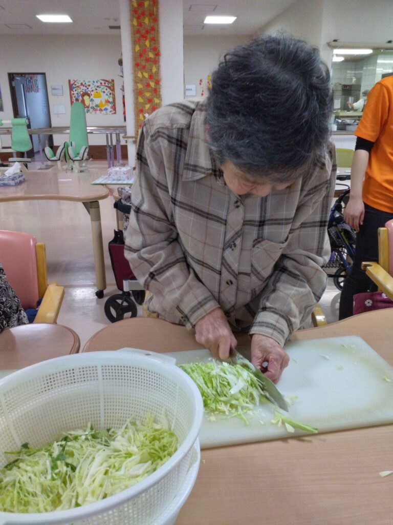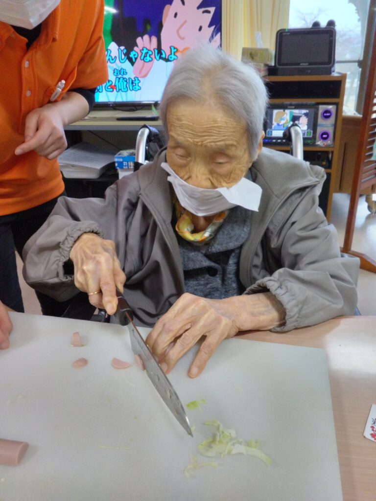 キャベツの千切りや魚肉ソーセージを切っていただくところからしていただき、「長いこと包丁使ってないのに~」と言われながらも皆様、華麗な包丁捌きでカットされていました。職員も見とれてしまいました!(^^)!
