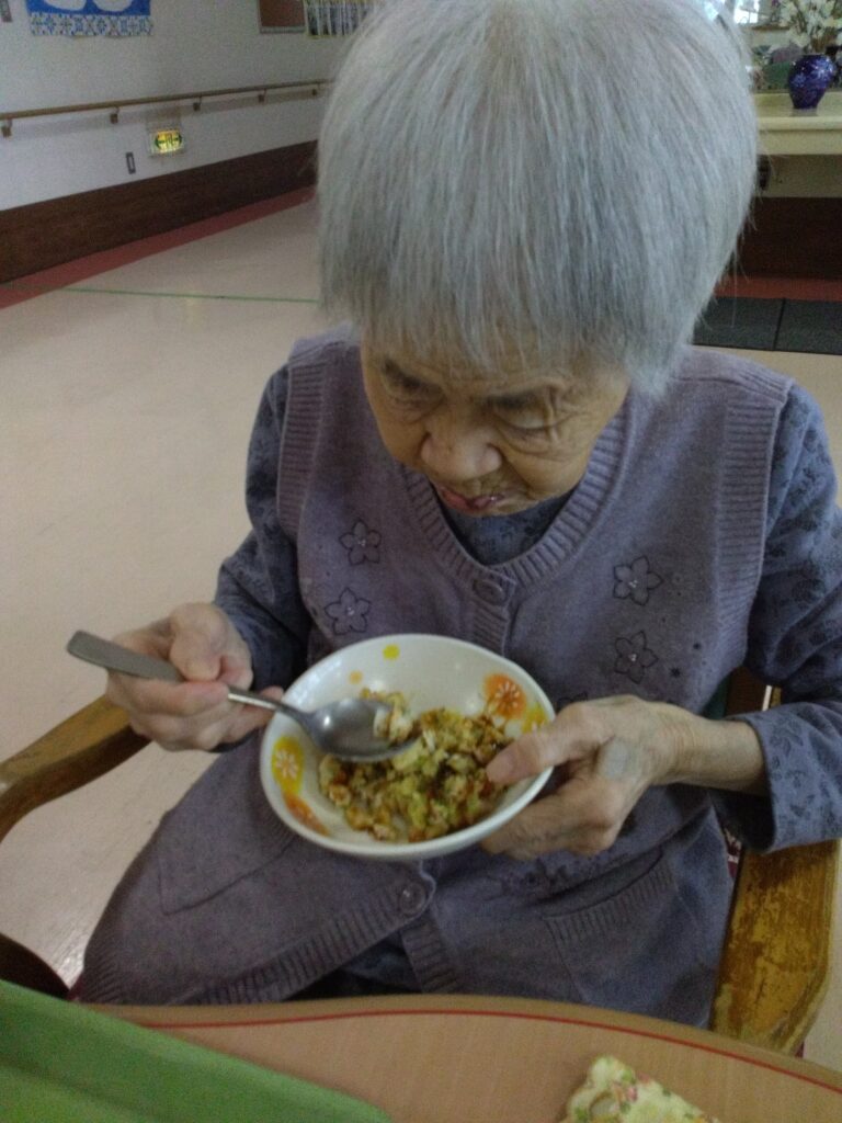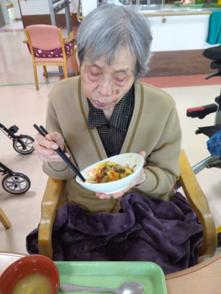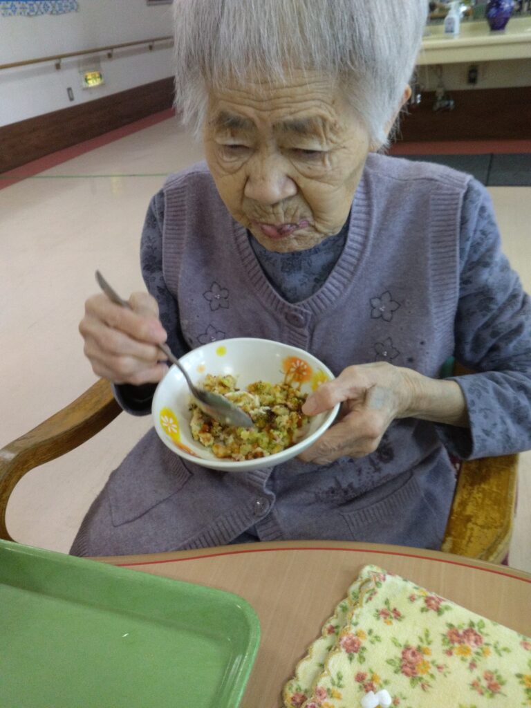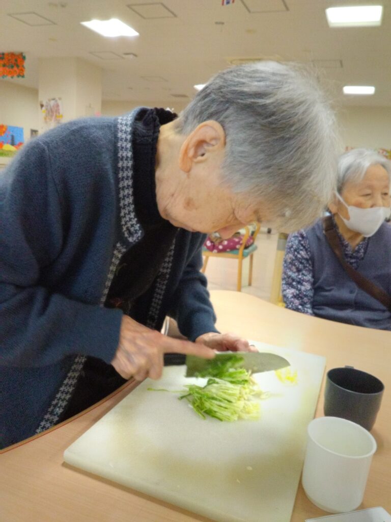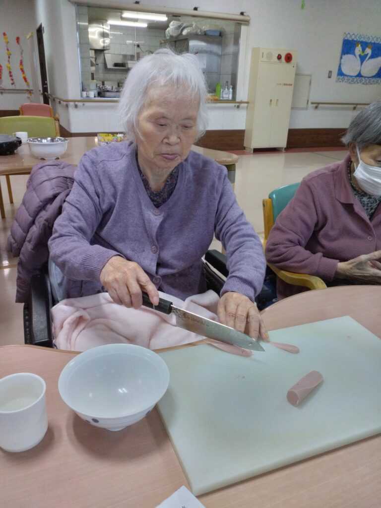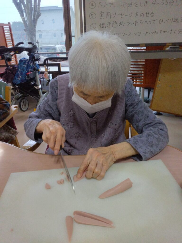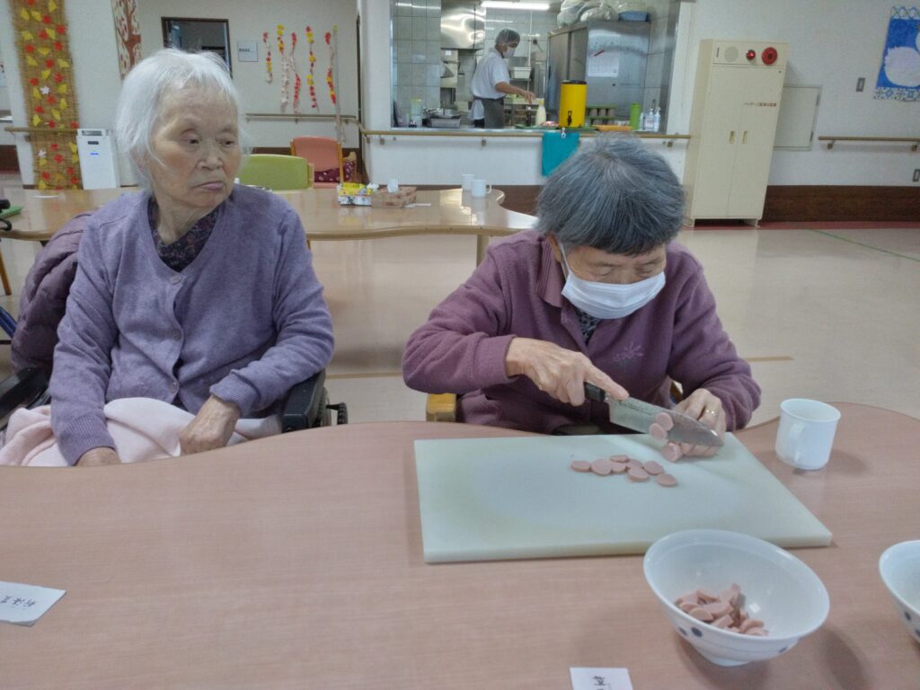 キャベツの千切りや魚肉ソーセージを切っていただくところからしていただき、「長いこと包丁使ってないのに~」と言われながらも皆様、華麗な包丁捌きでカットされていました。職員も見とれてしまいました!(^^)!
