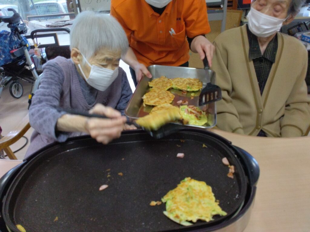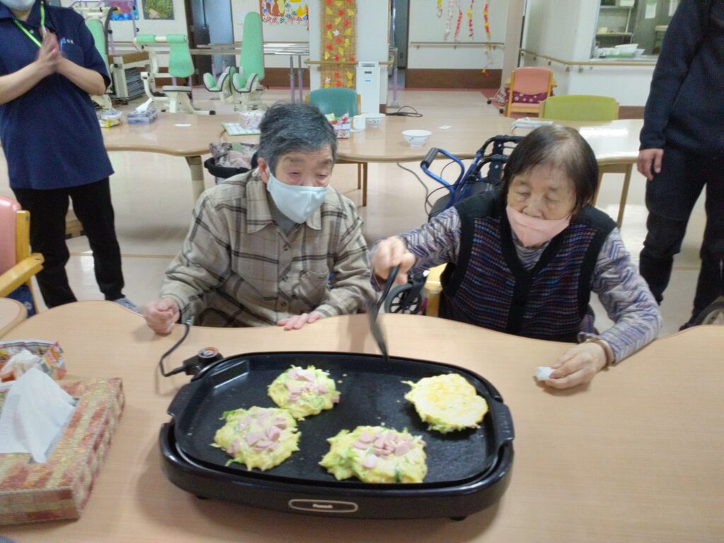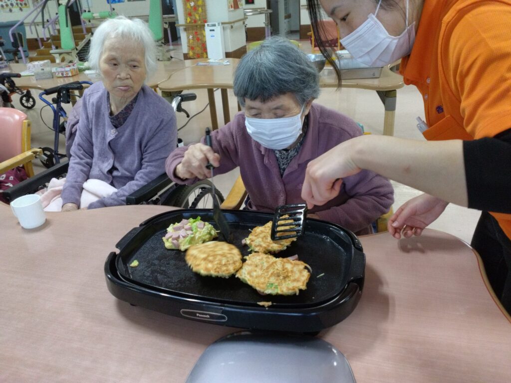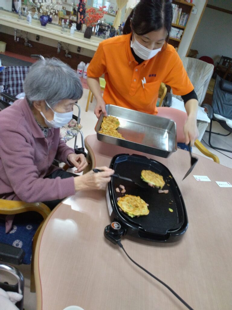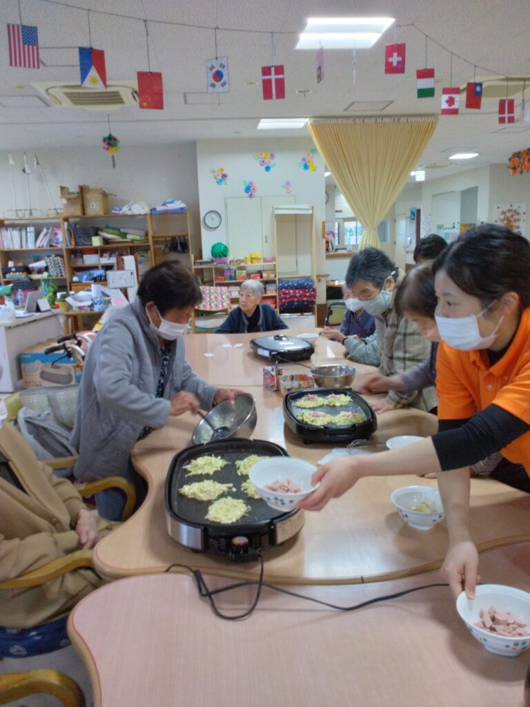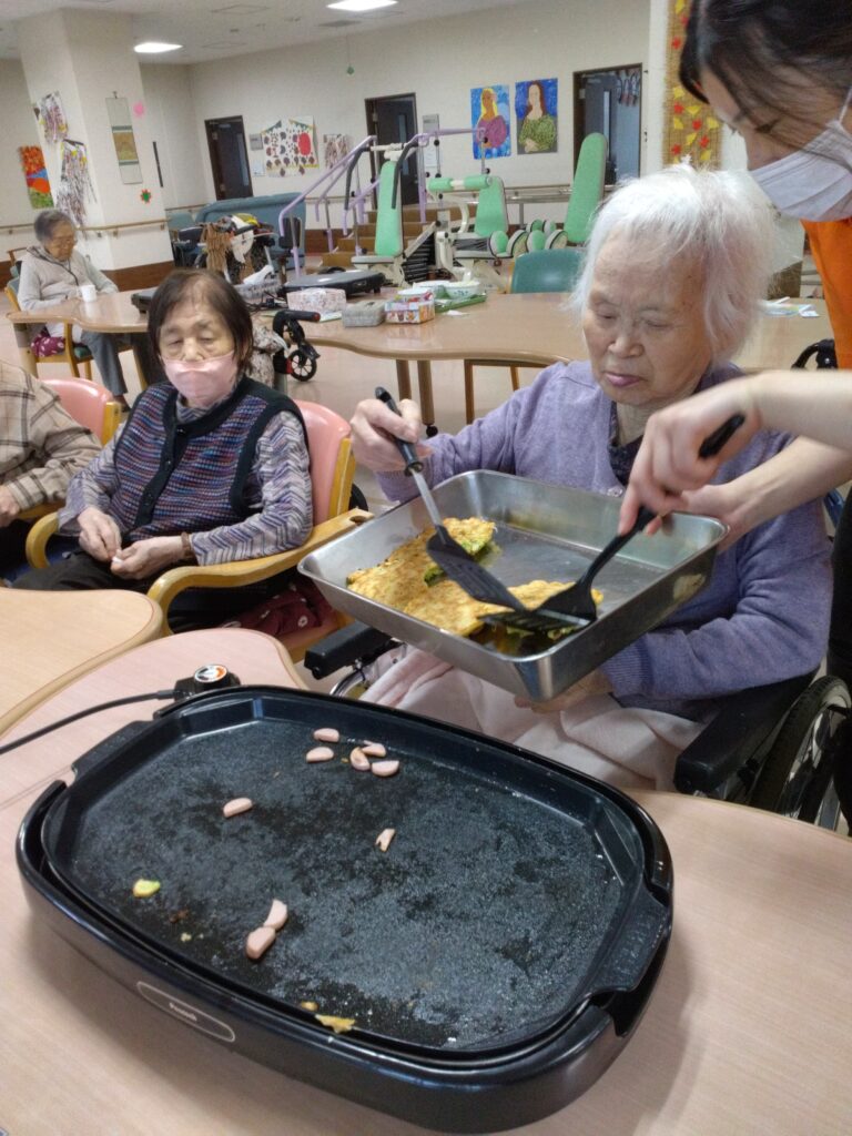 ホットプレートで生地を焼き、ひっくり返すときはお好み焼きがすべってひっくり返しにくかったですが、職員と協力しながら無事皆様ひっくり返すことができました。焼き上がるまではしりとりをしながら楽しく待ちました。
