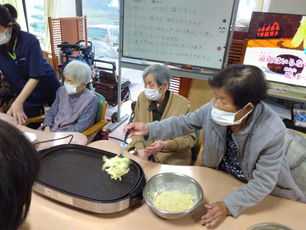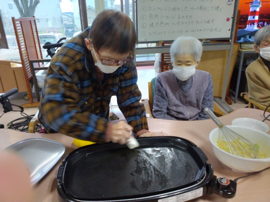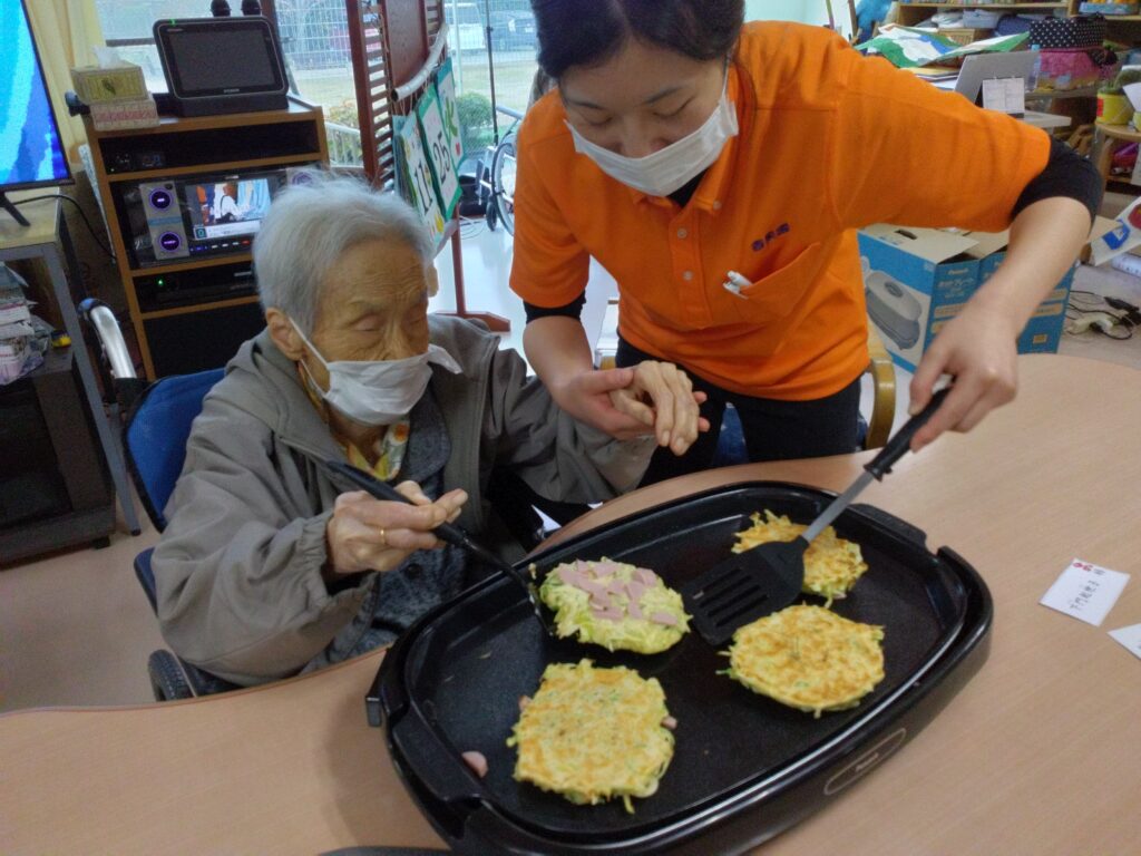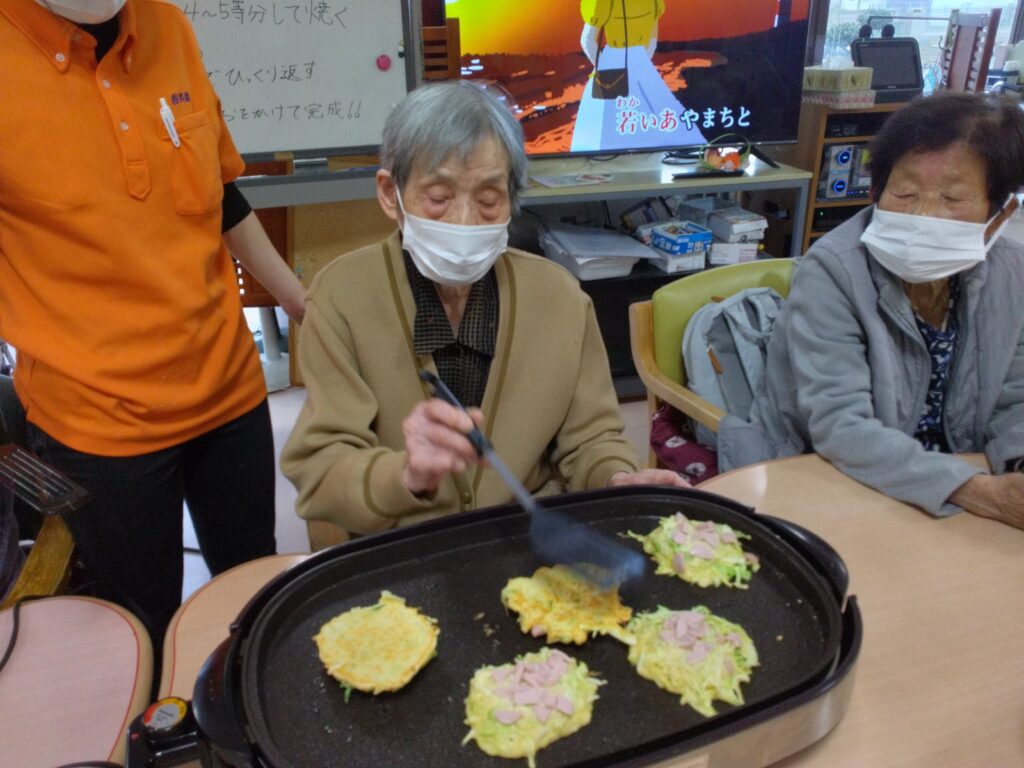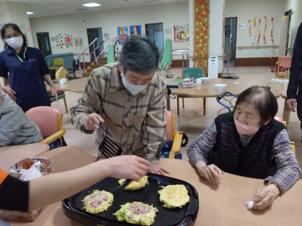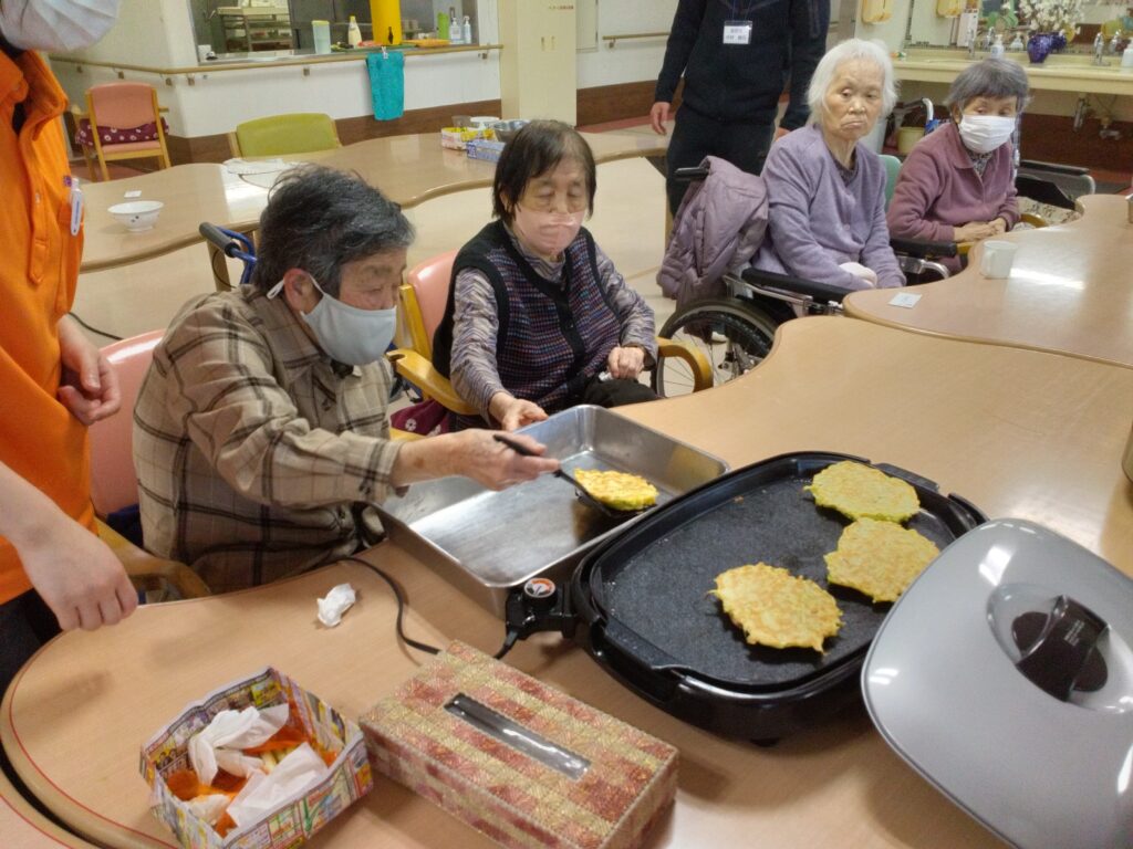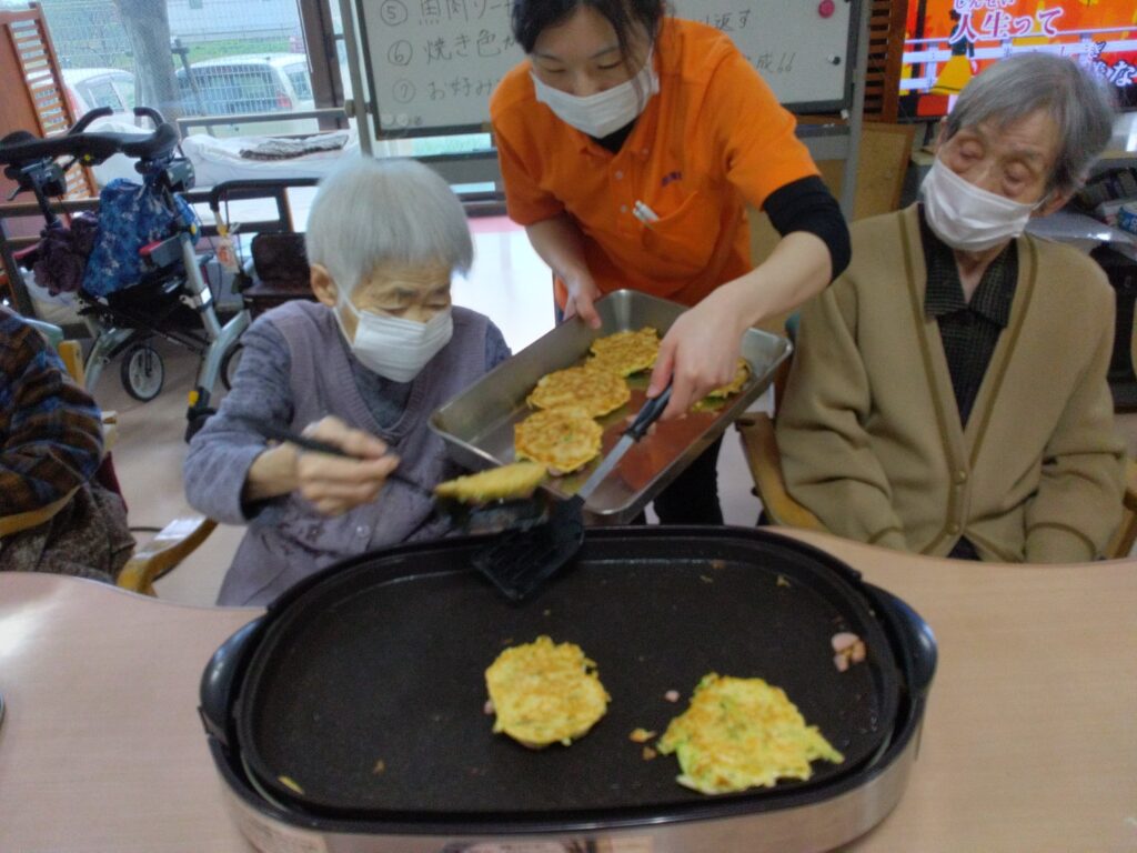 ホットプレートで生地を焼き、ひっくり返すときはお好み焼きがすべってひっくり返しにくかったですが、職員と協力しながら無事皆様ひっくり返すことができました。焼き上がるまではしりとりをしながら楽しく待ちました。