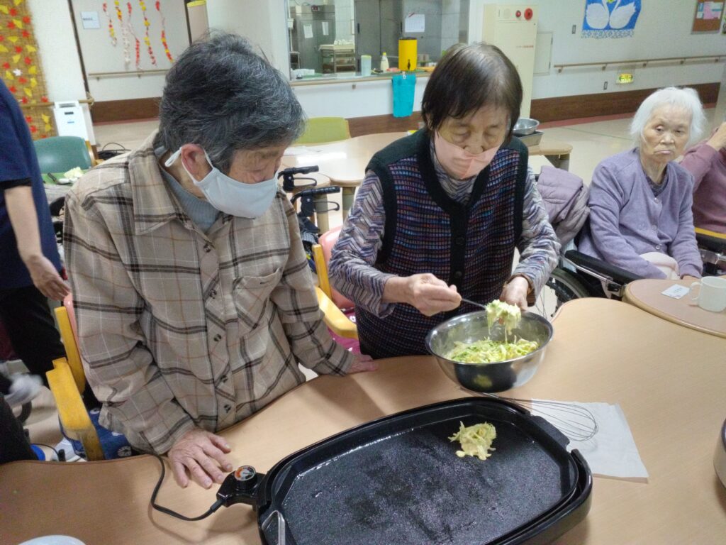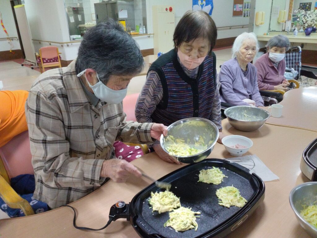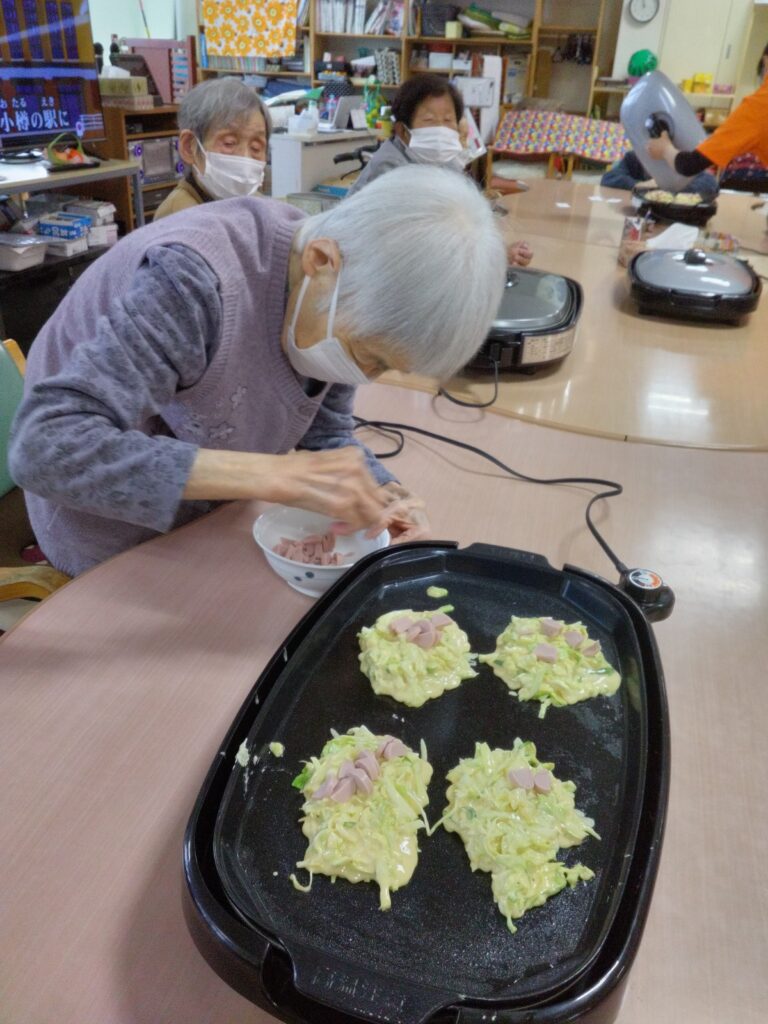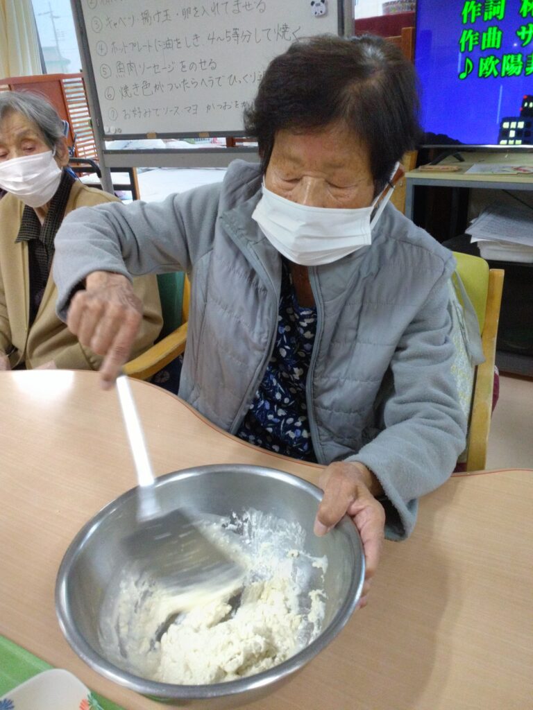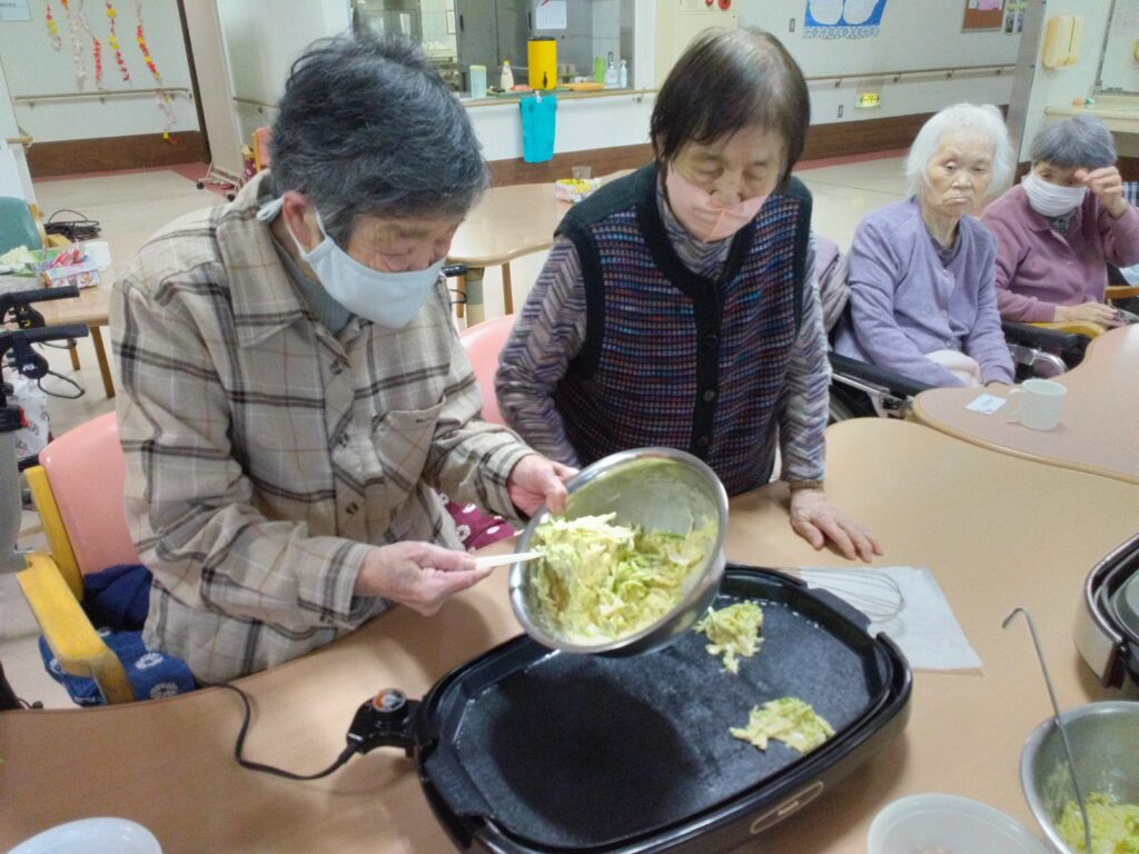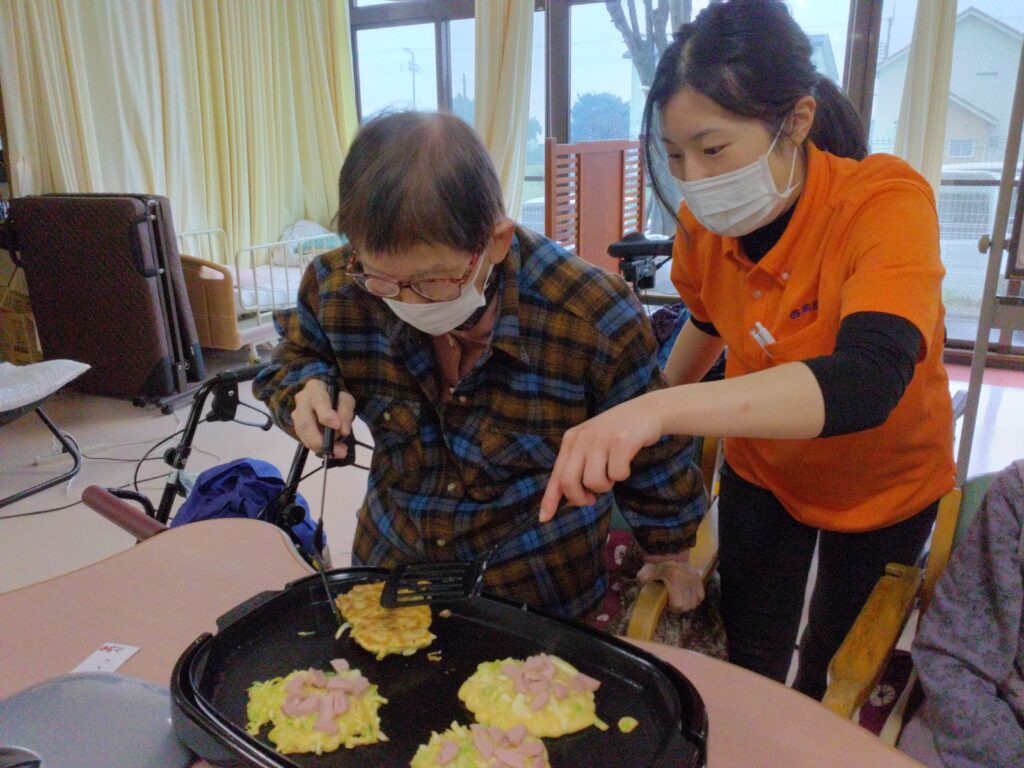 ホットプレートで生地を焼き、ひっくり返すときはお好み焼きがすべってひっくり返しにくかったですが、職員と協力しながら無事皆様ひっくり返すことができました。焼き上がるまではしりとりをしながら楽しく待ちました。