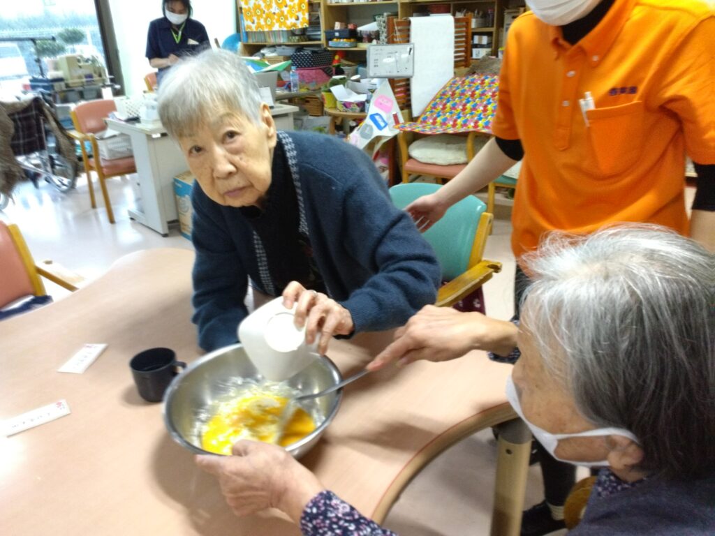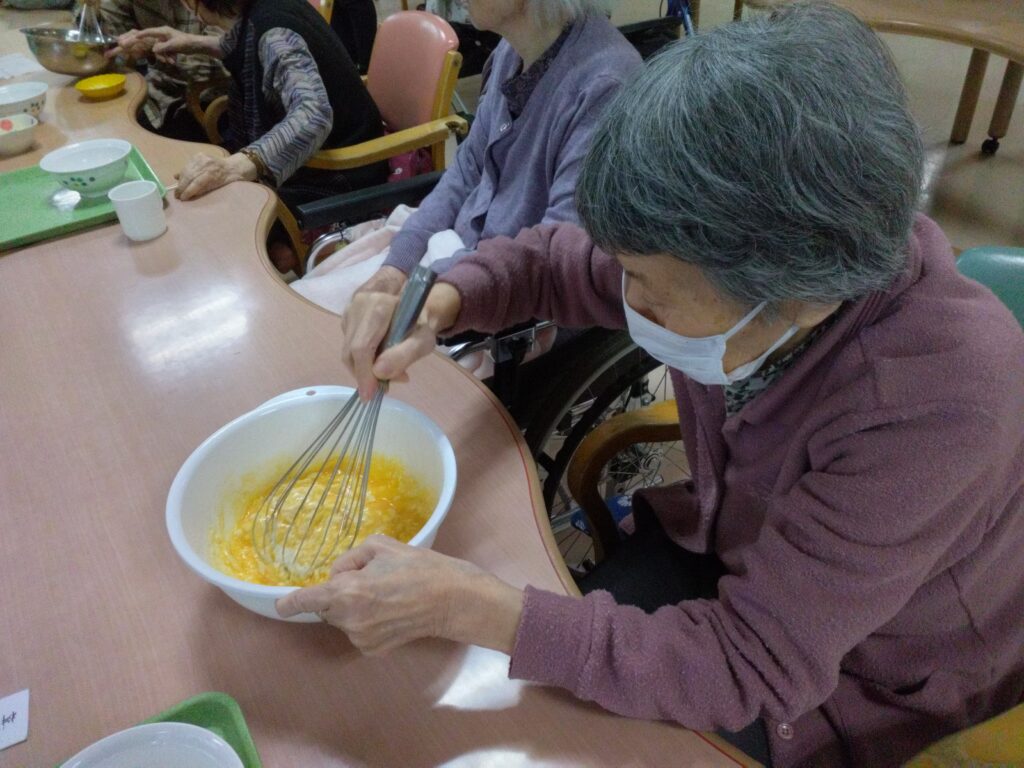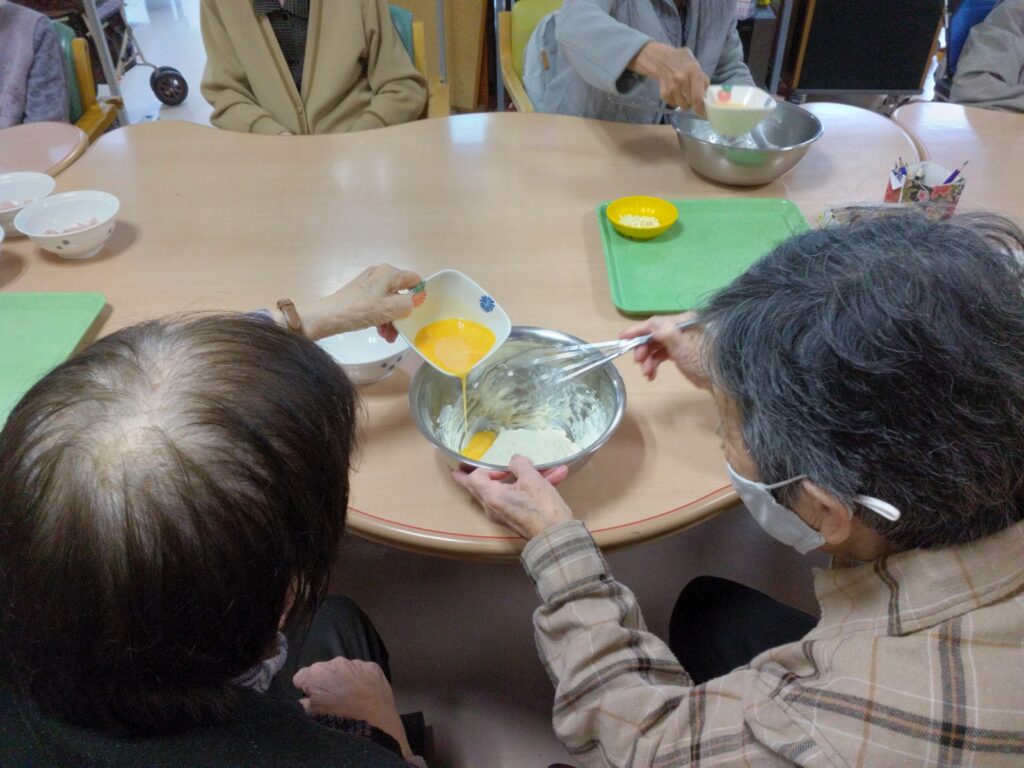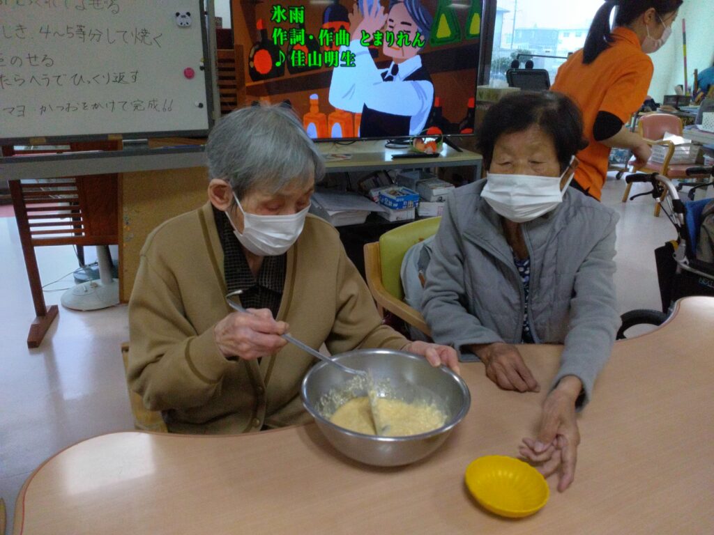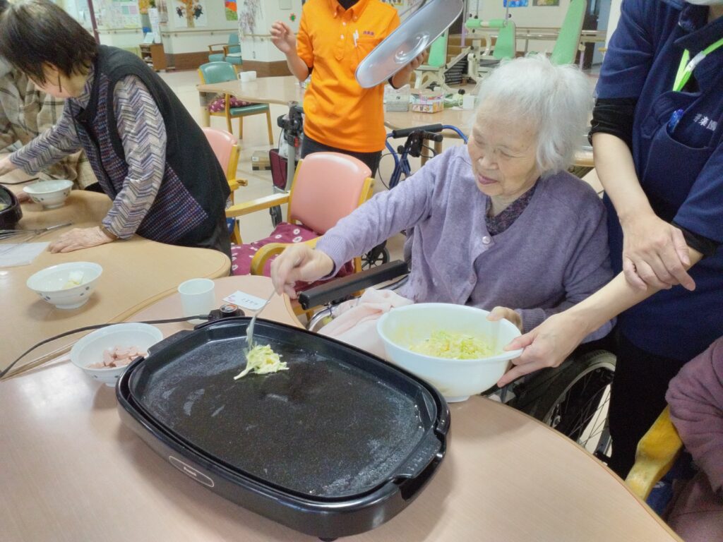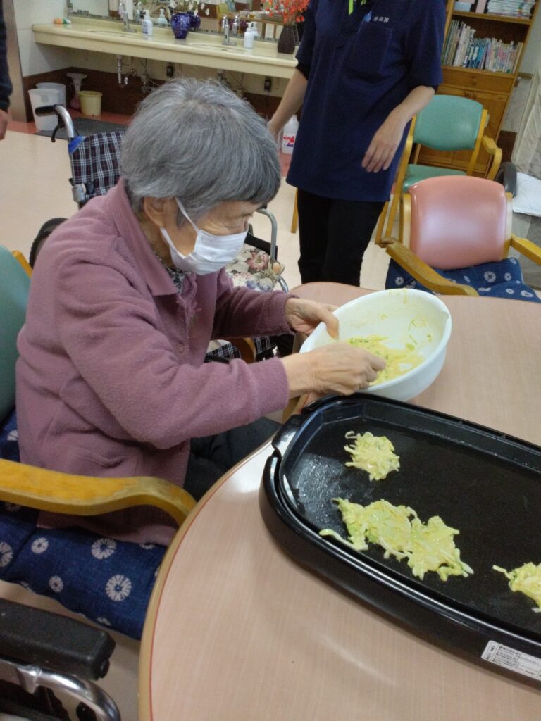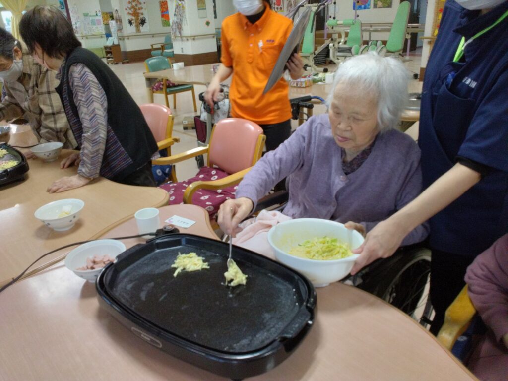 ホットプレートで生地を焼き、ひっくり返すときはお好み焼きがすべってひっくり返しにくかったですが、職員と協力しながら無事皆様ひっくり返すことができました。焼き上がるまではしりとりをしながら楽しく待ちました。