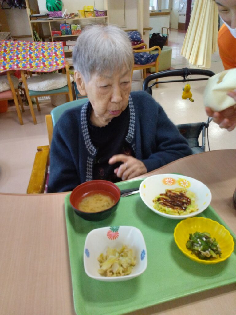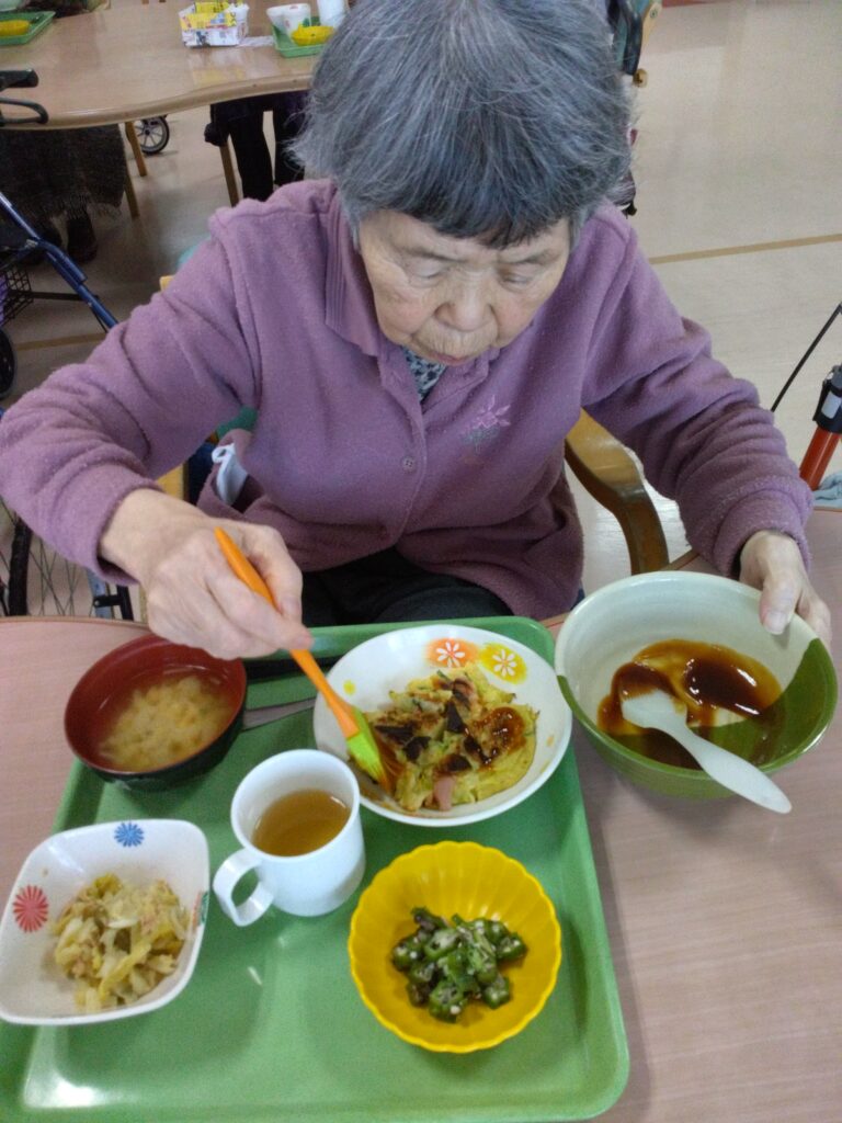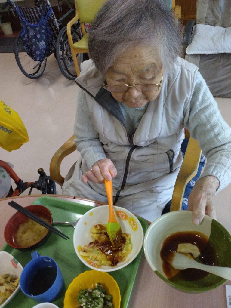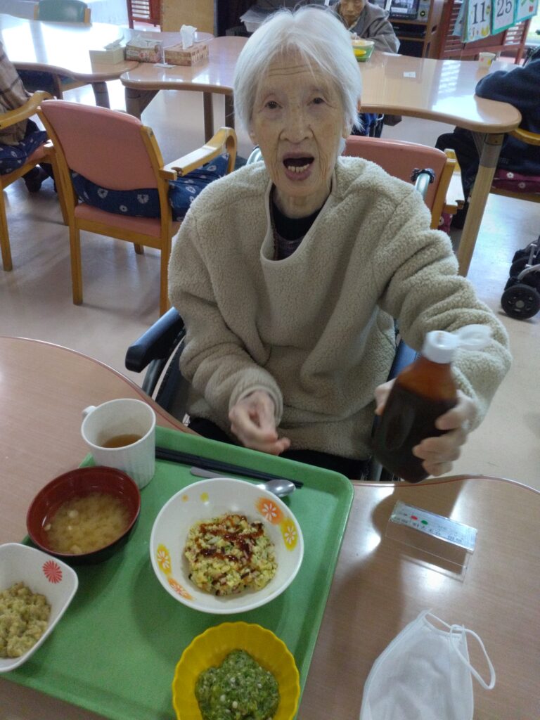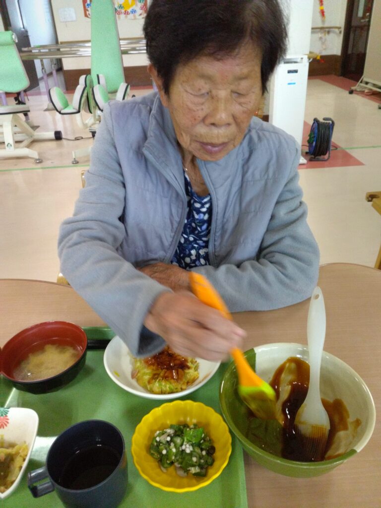 昼食の際はソース、マヨネーズ、青のり、カツオを自由にトッピングし、おいしく仕上げることができました。「おいしい!」と言っていただき、皆様完食されていました。おいしそうに召し上がられる皆様を見て職員一同嬉しかったです♪