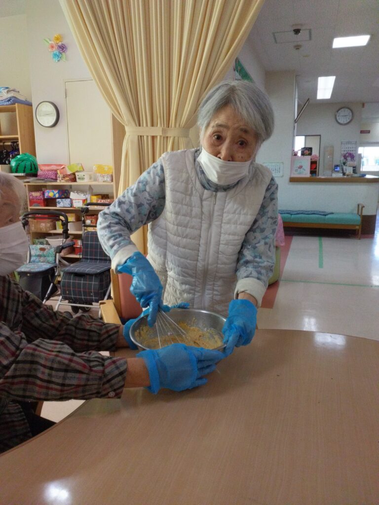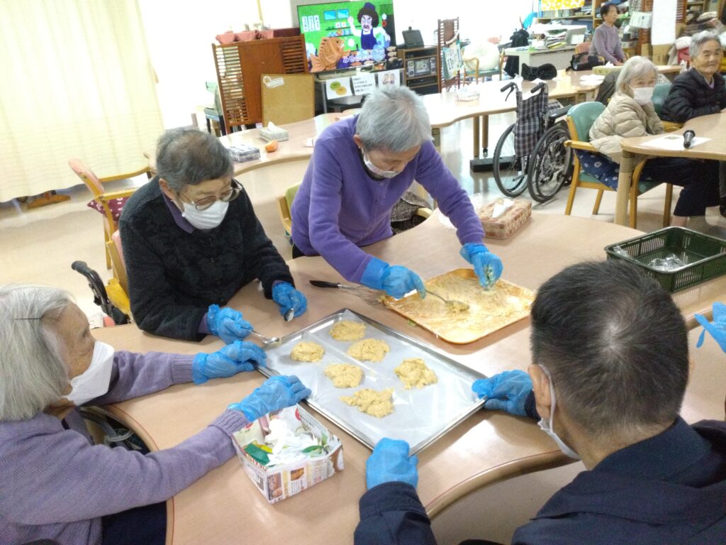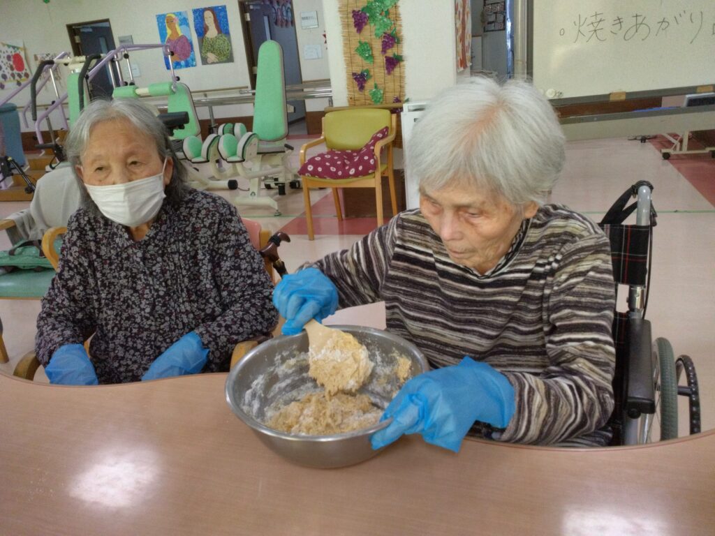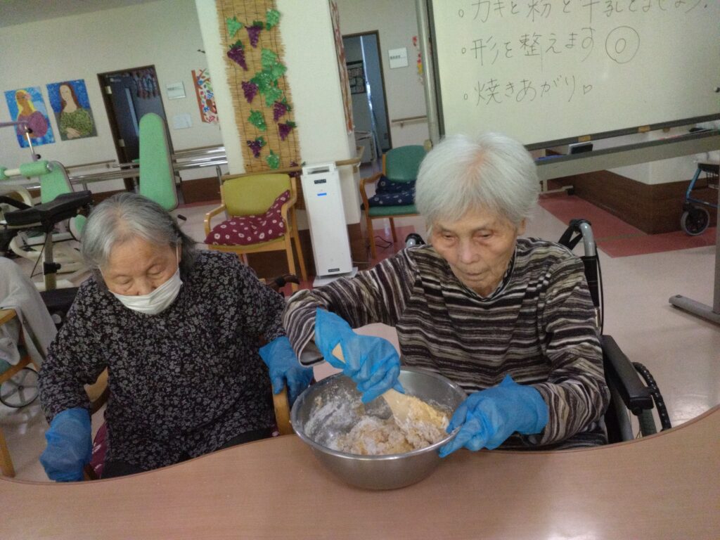 柿のおやつ作りですが、ホットケーキミックスでスコーンを作りました🍪グループで材料を混ぜて生地を作り人数分に分け成形していくのですが、三者三様!!扱いにくい生地でしたのでみんなで一生懸命、意見を出し合い、考えておられました(#^.^#)