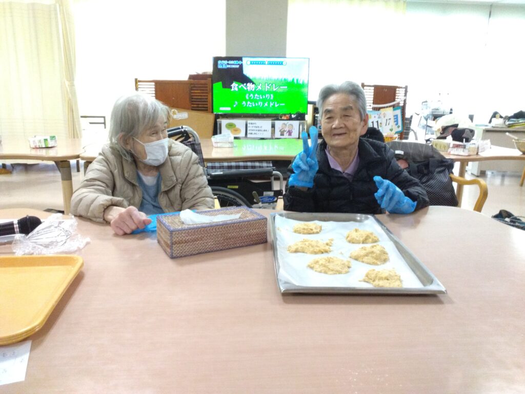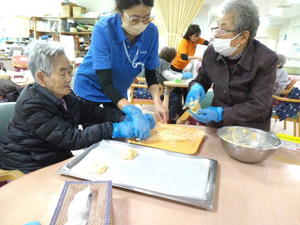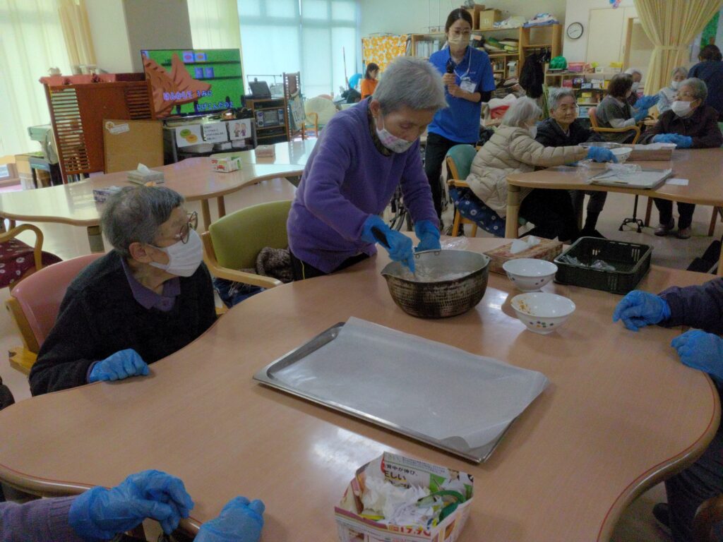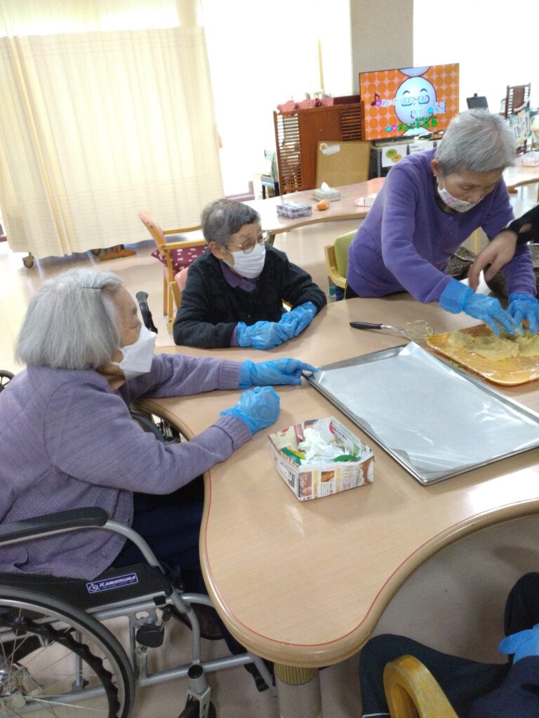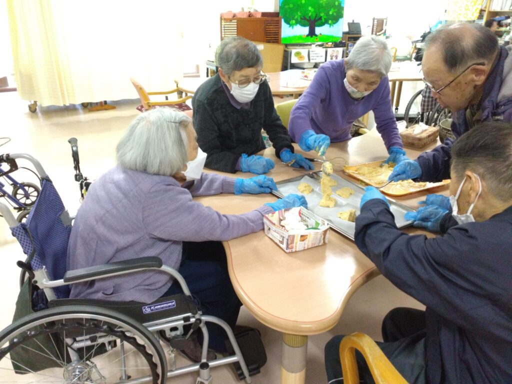 柿のおやつ作りですが、ホットケーキミックスでスコーンを作りました🍪グループで材料を混ぜて生地を作り人数分に分け成形していくのですが、三者三様!!扱いにくい生地でしたのでみんなで一生懸命、意見を出し合い、考えておられました(#^.^#)