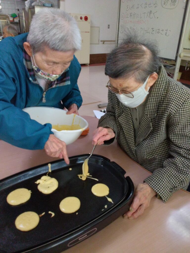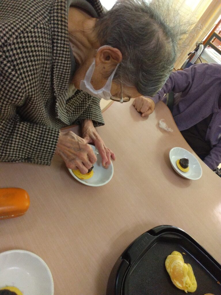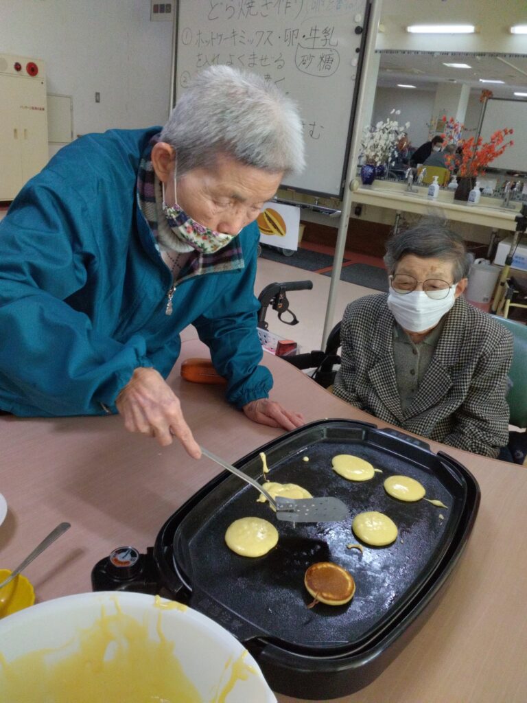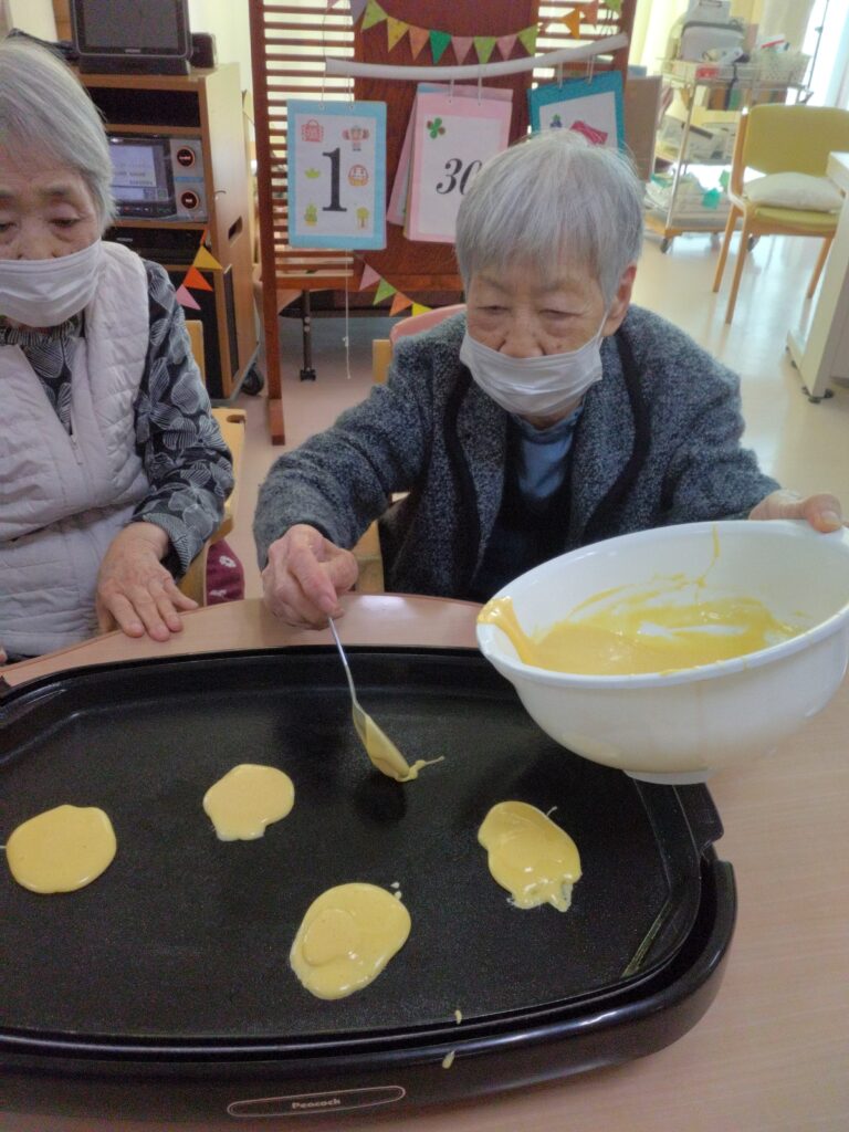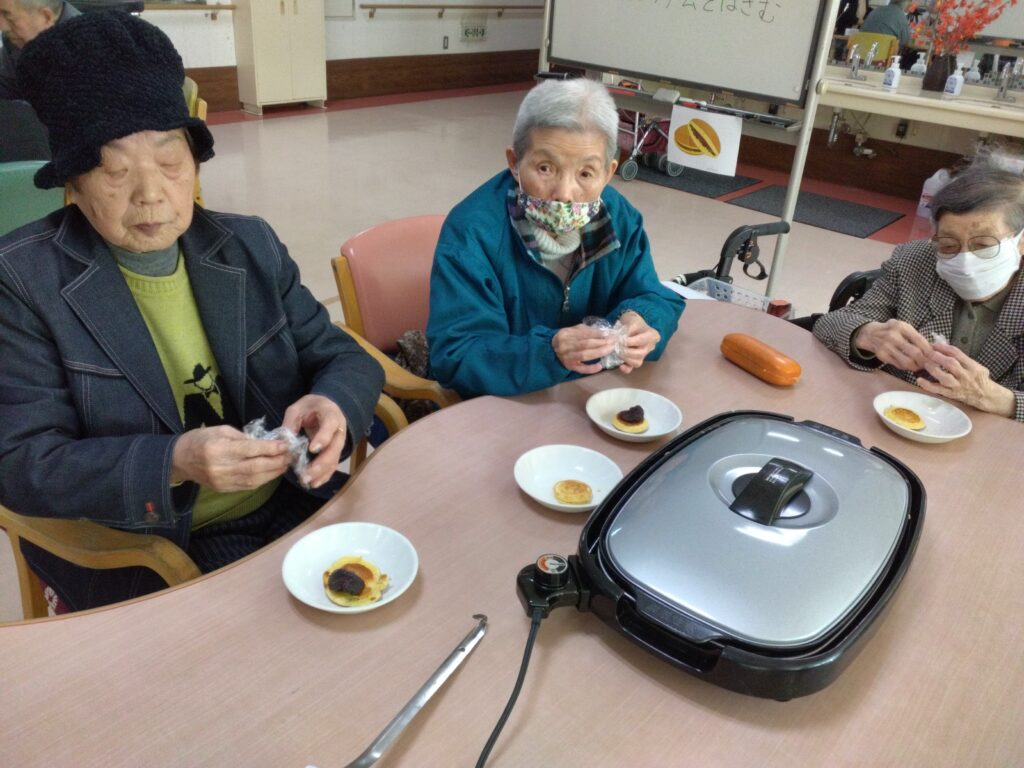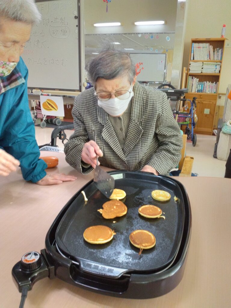 一月最後の行事はかねてよりリクエストの多かった、どらやき作りです!! 各テーブルでどら焼きの生地を作り、ホットプレートで焼きました(^^)/生地はふわふわでかなりボリュームがありました!あんことホイップクリームを挟んで、できあがり!!