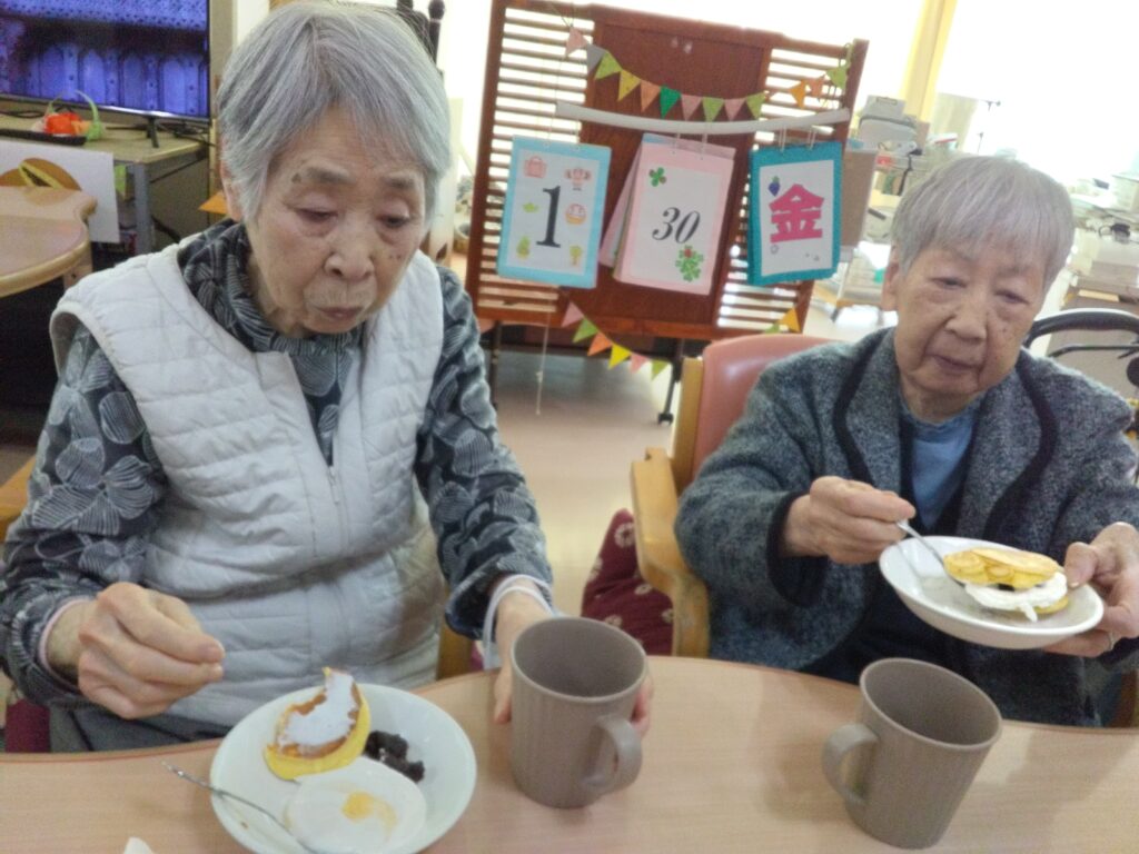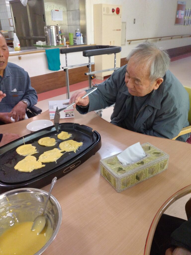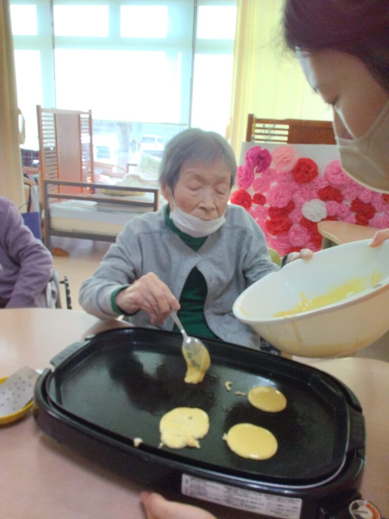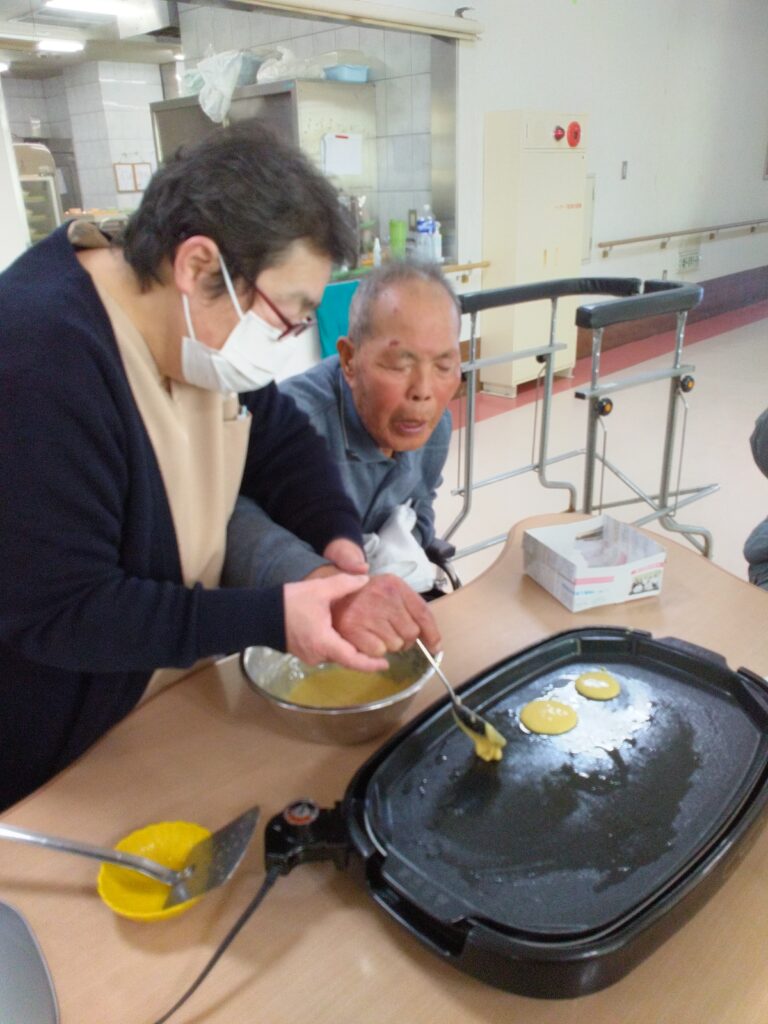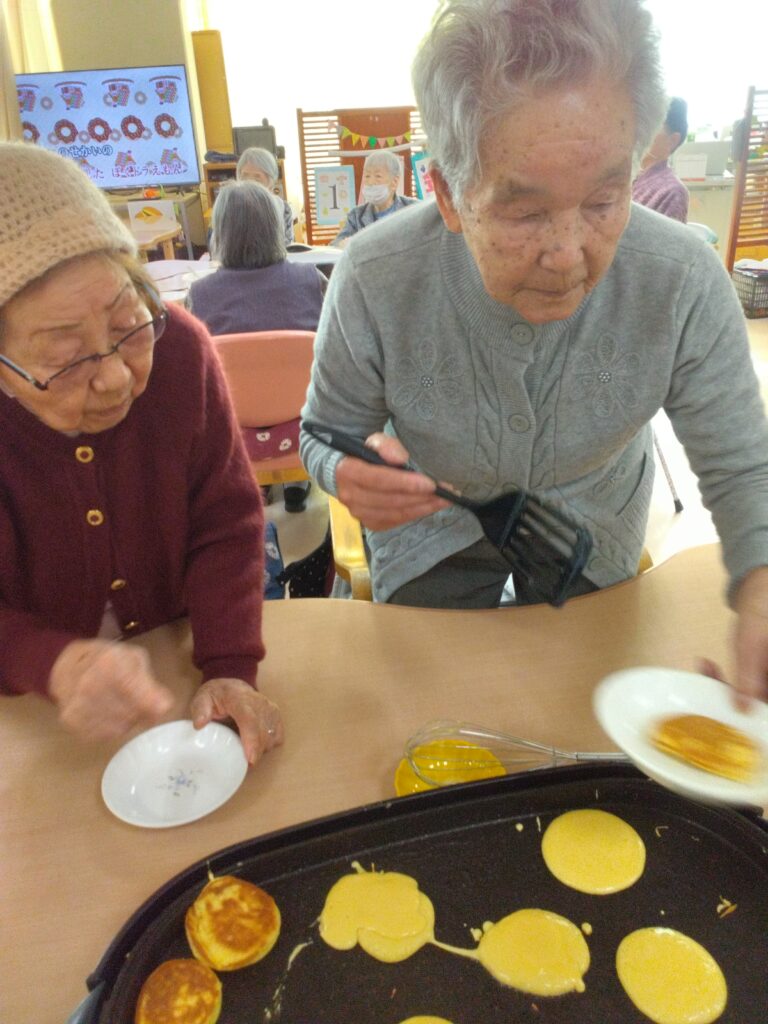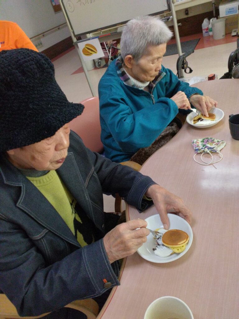 一月最後の行事はかねてよりリクエストの多かった、どらやき作りです!! 各テーブルでどら焼きの生地を作り、ホットプレートで焼きました(^^)/生地はふわふわでかなりボリュームがありました!あんことホイップクリームを挟んで、できあがり!!