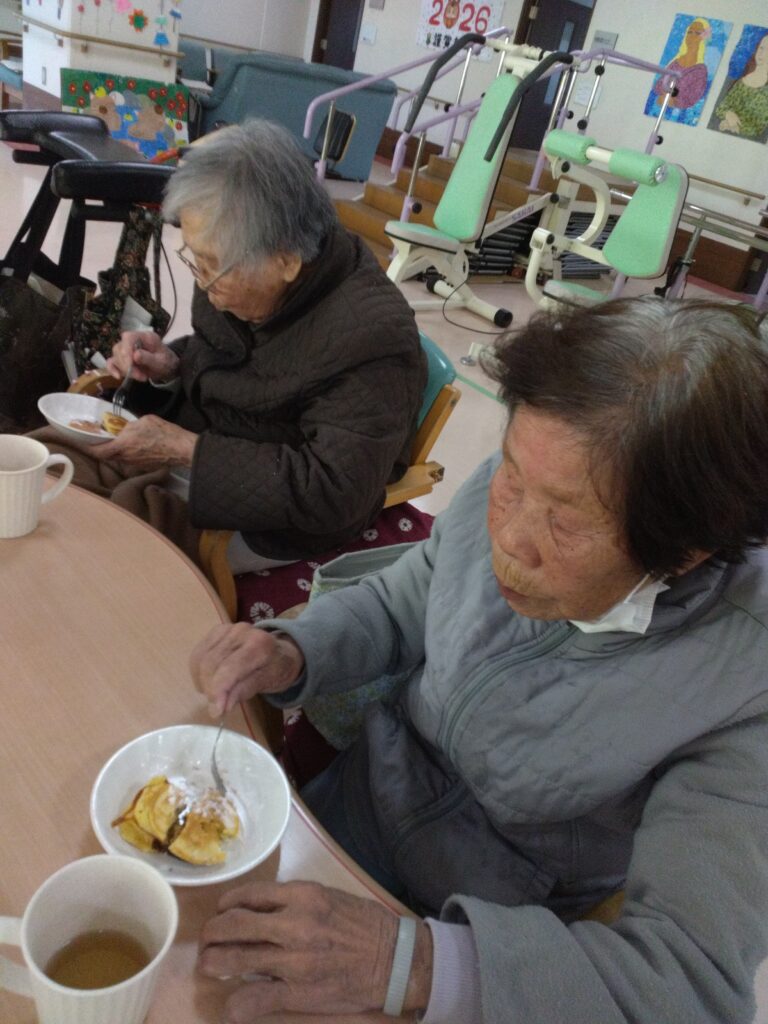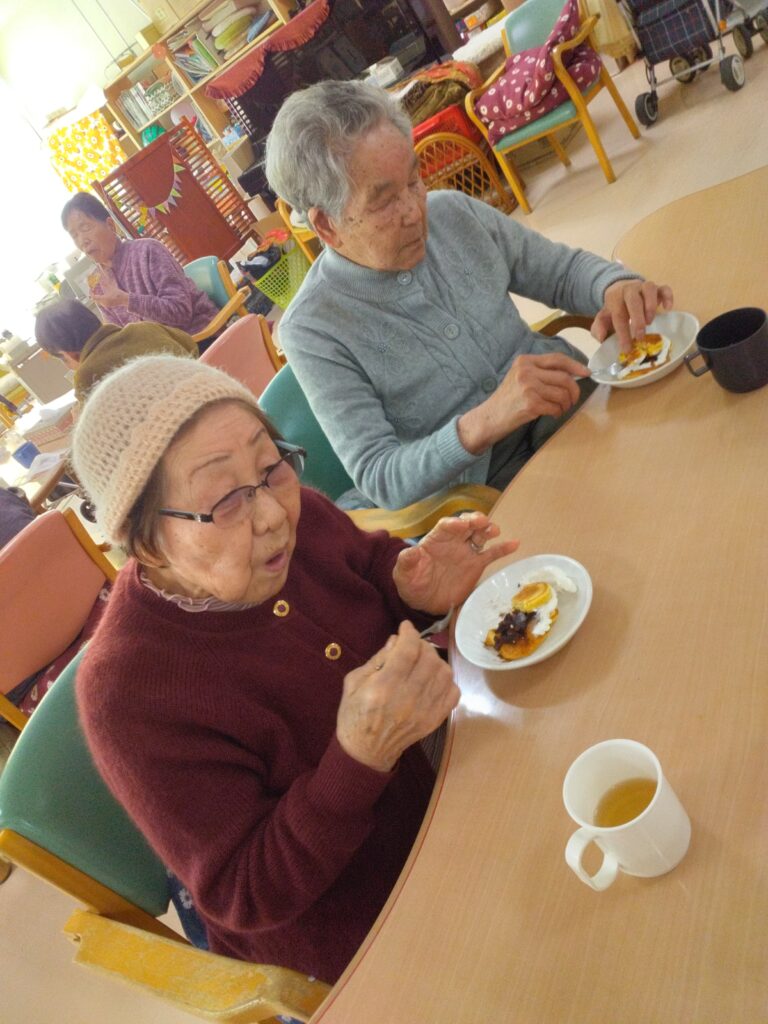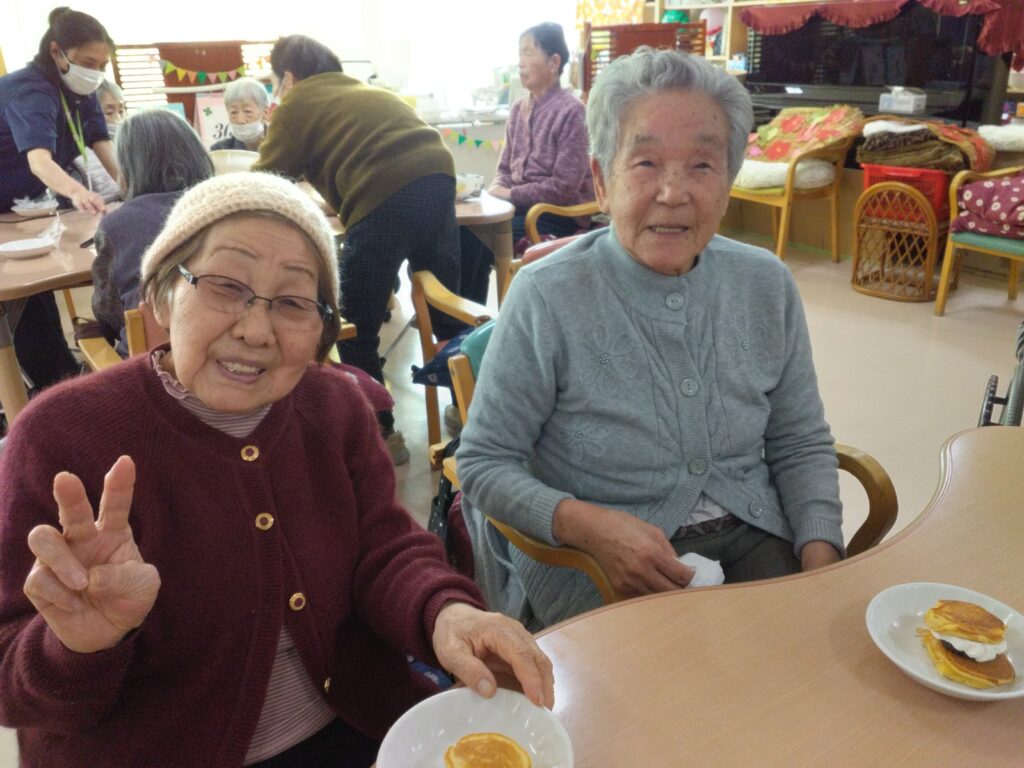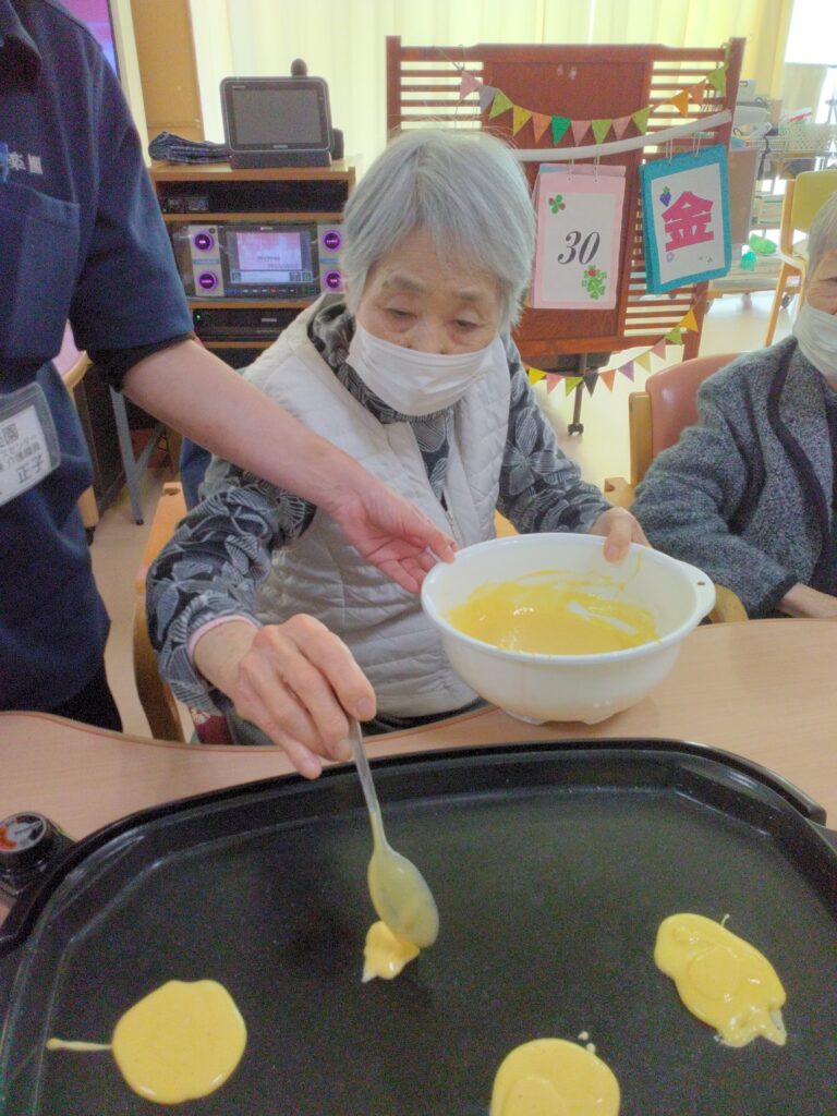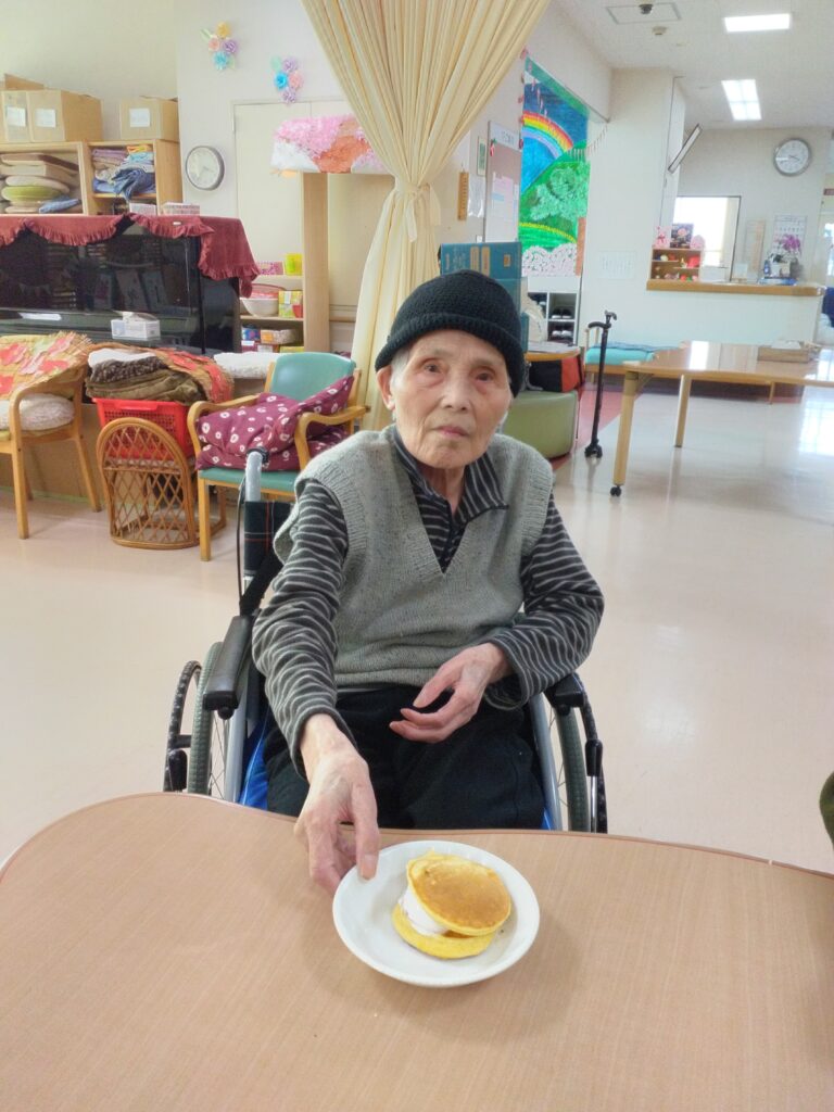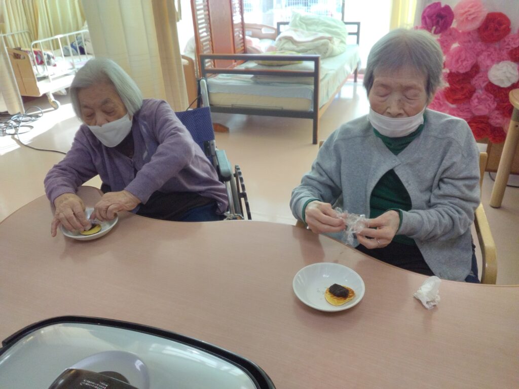 一月最後の行事はかねてよりリクエストの多かった、どらやき作りです!! 各テーブルでどら焼きの生地を作り、ホットプレートで焼きました(^^)/生地はふわふわでかなりボリュームがありました!あんことホイップクリームを挟んで、できあがり!!