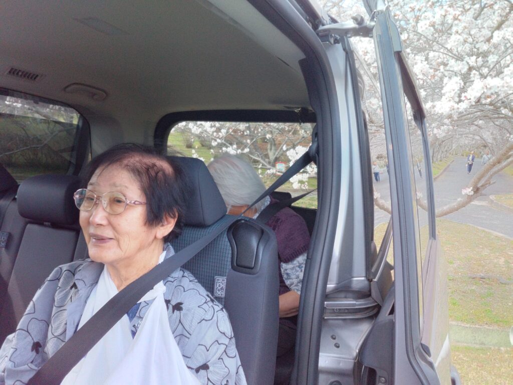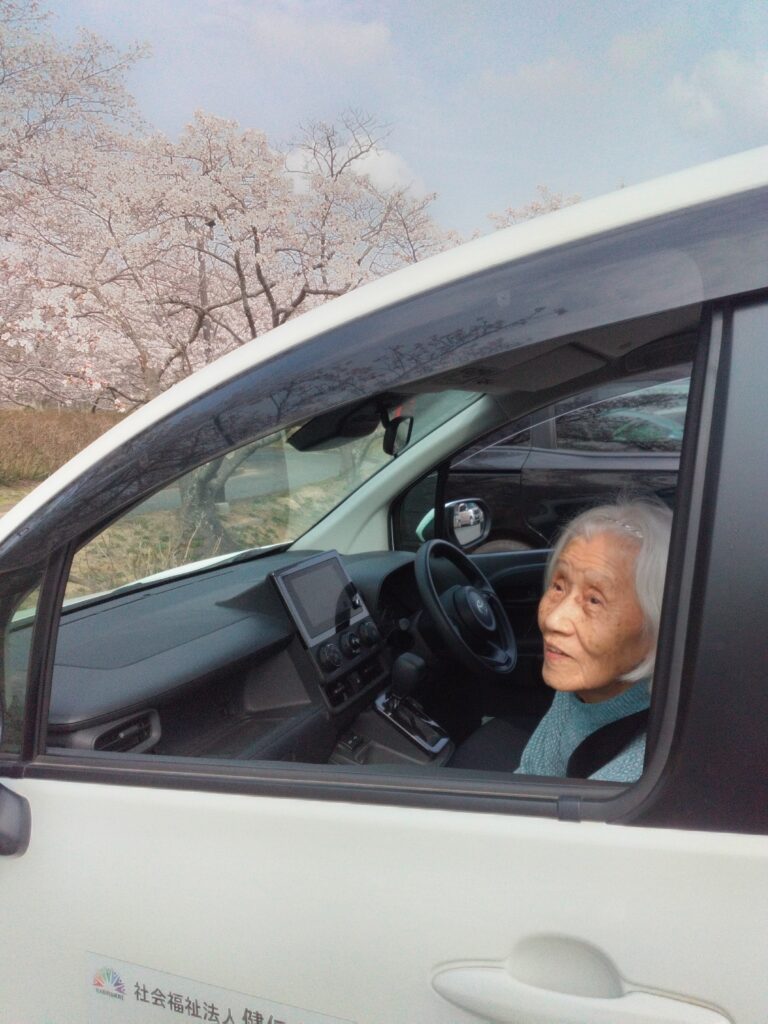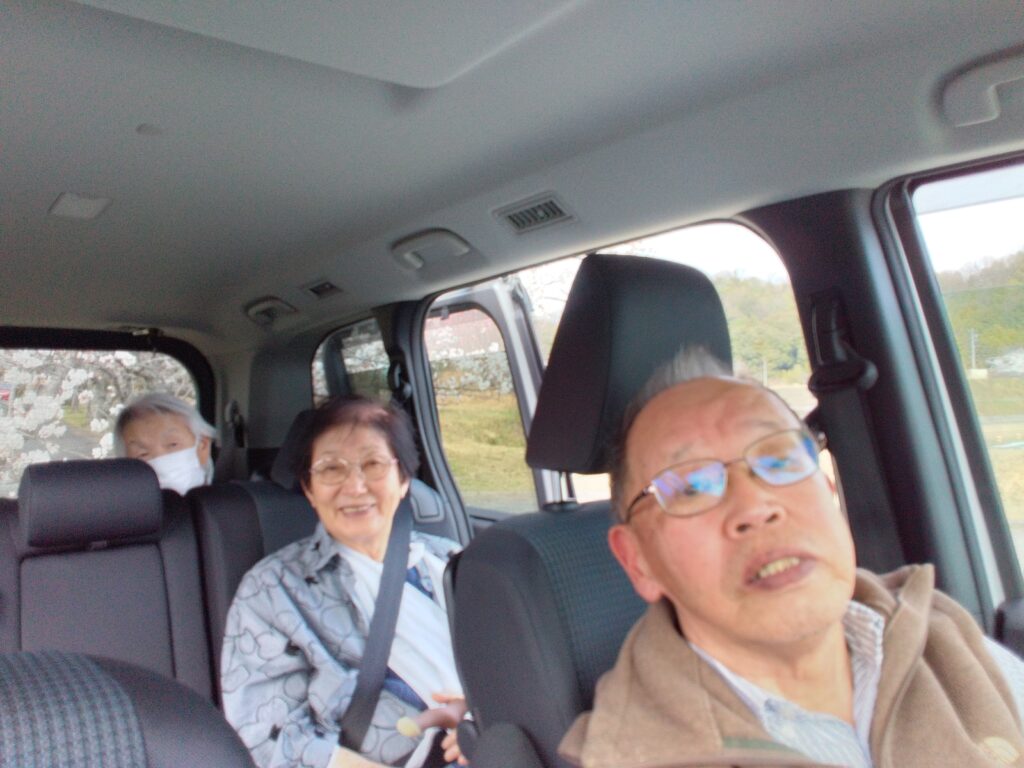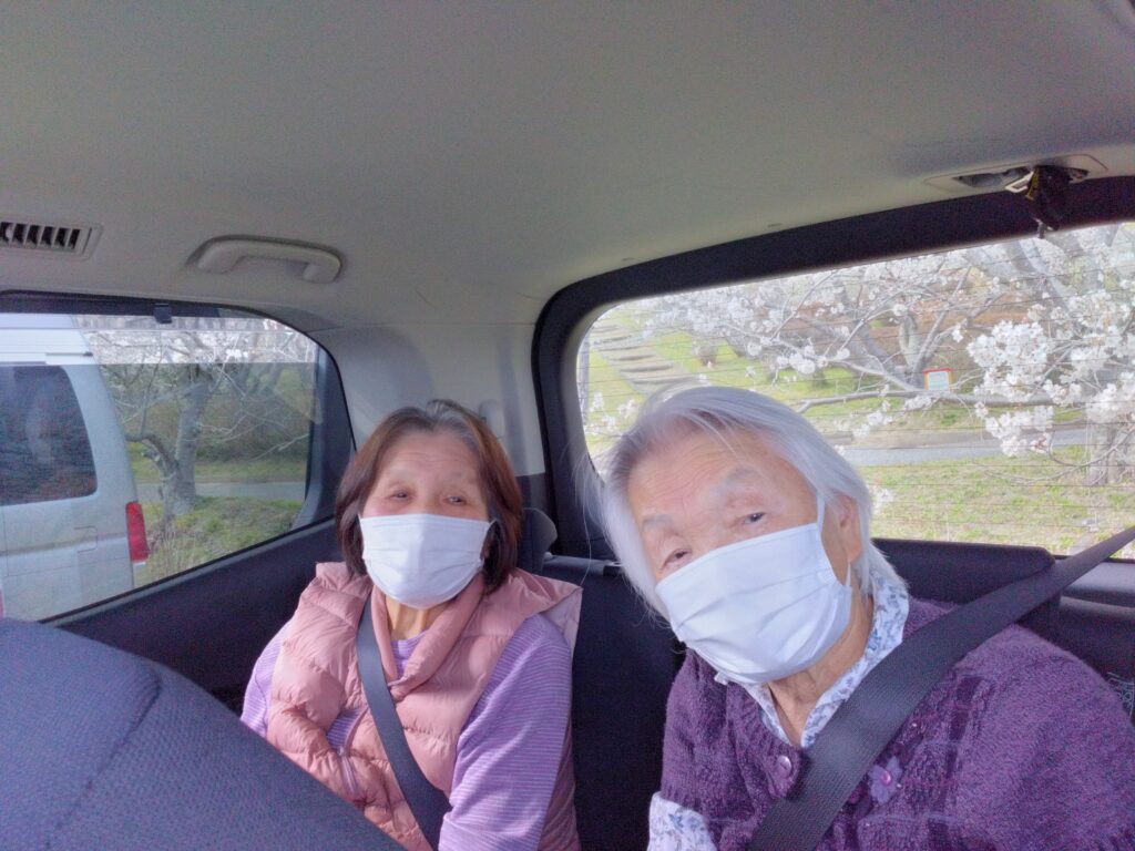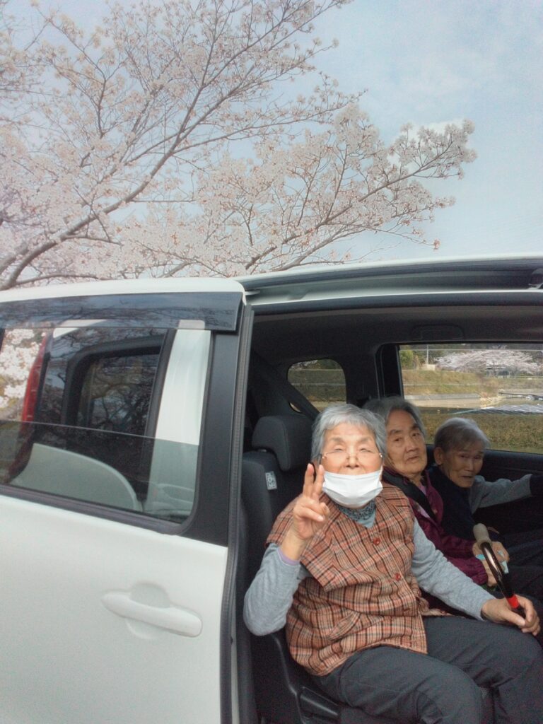 温かい日差しの中、利用者様と一緒に市内の桜スポットへドライブに出かけました。車内では「昔お父ちゃんとここに来たわ~(^^♪」「この店来たことあるでー!」といった会話が弾み、到着する前から皆さん楽しそうなご様子・・・( ^)o(^ )