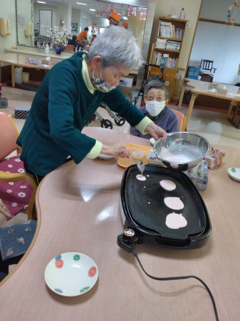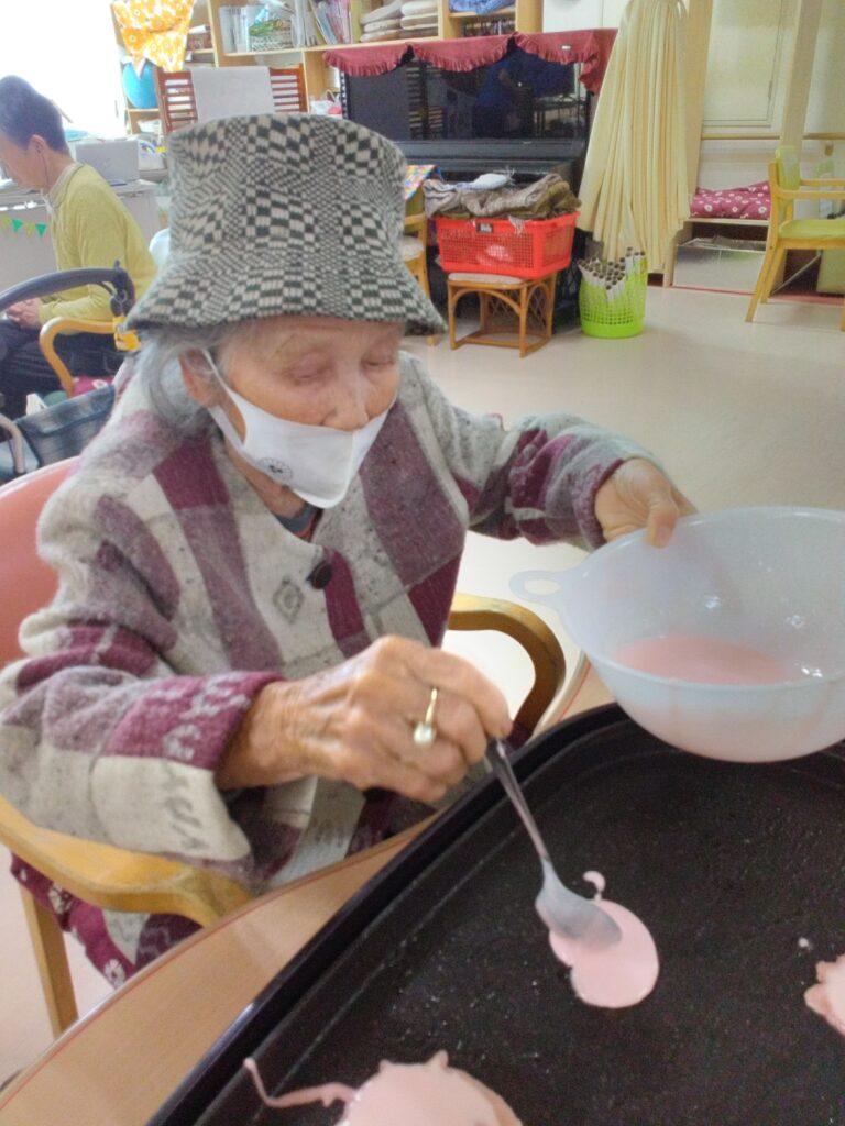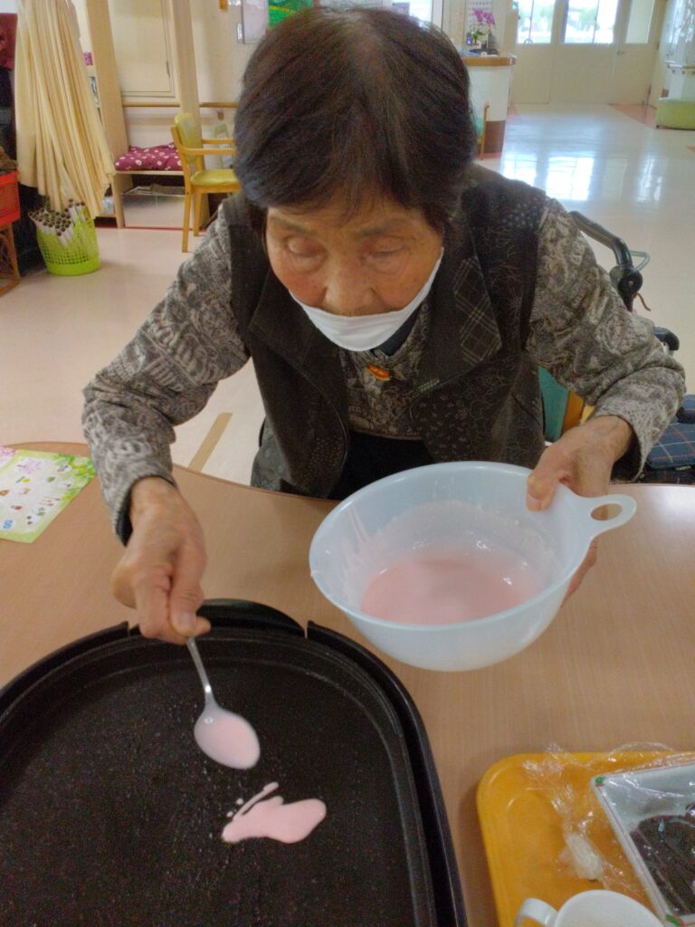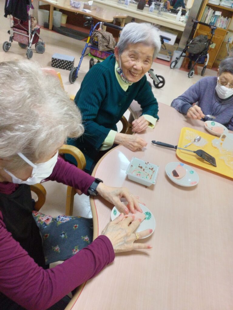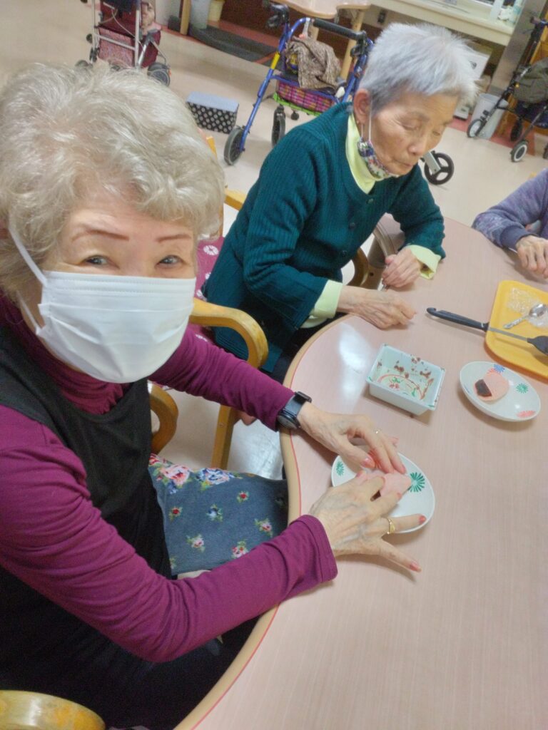 お持ち作りですが、お餅の生地をほんの桜色にするのが少し難しかったです(#^.^#)ホットプレートで生地を焼く際に皆さんまえのめりになりおいしく焼き上がるよう見守られていました!
