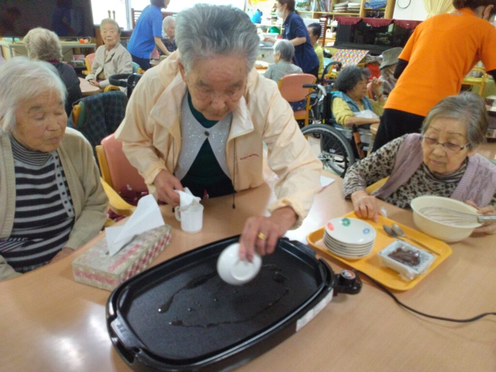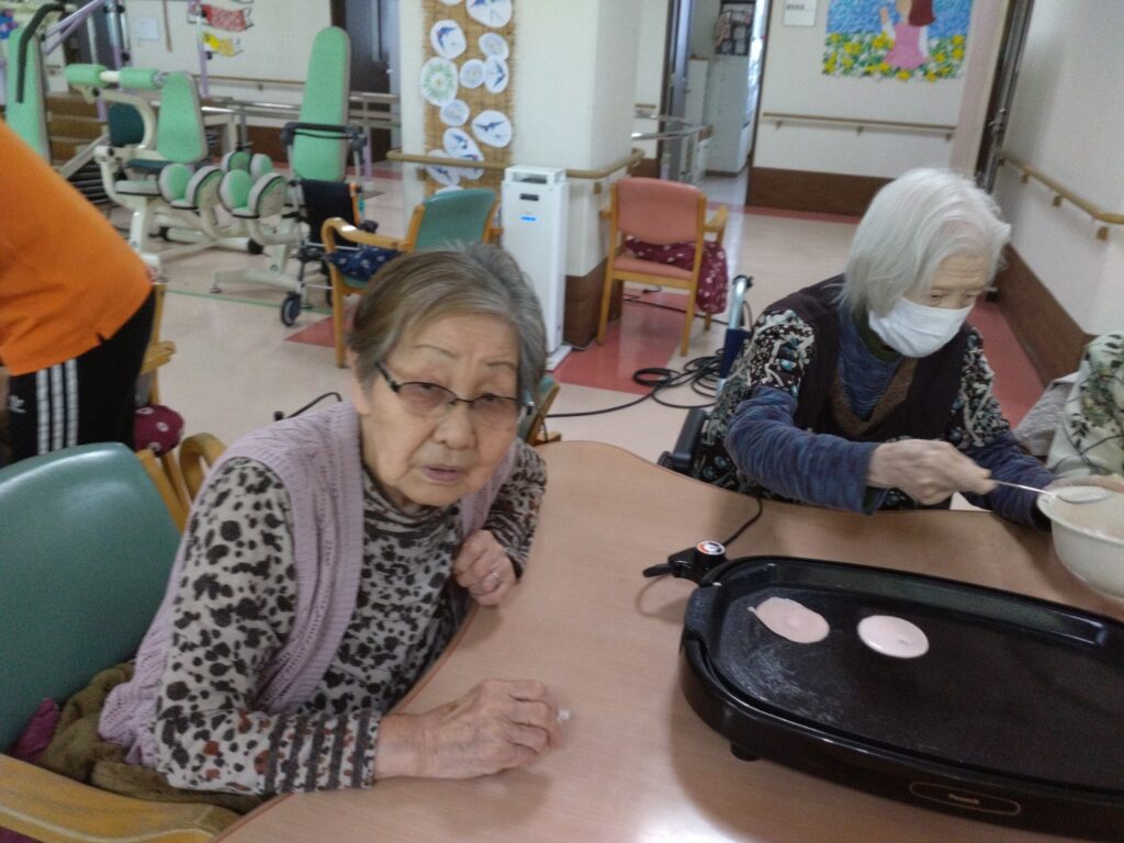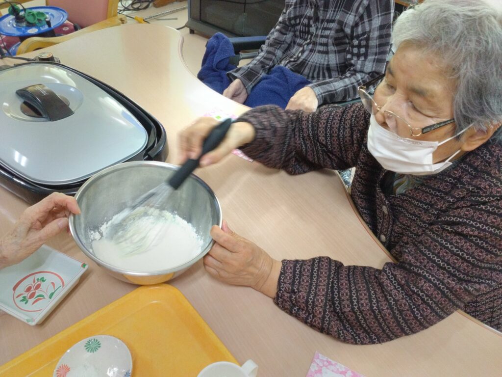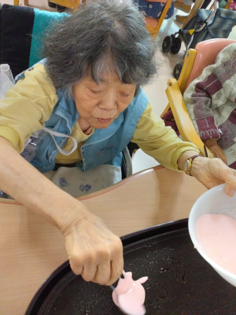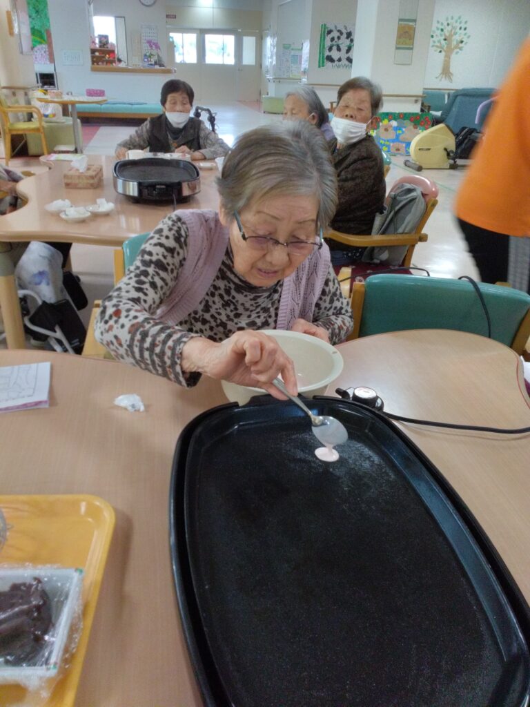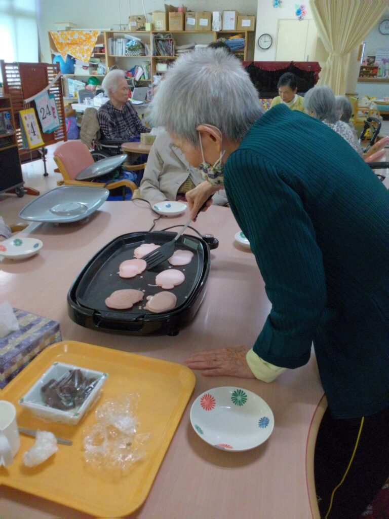 お持ち作りですが、お餅の生地をほんの桜色にするのが少し難しかったです(#^.^#)ホットプレートで生地を焼く際に皆さんまえのめりになりおいしく焼き上がるよう見守られていました!