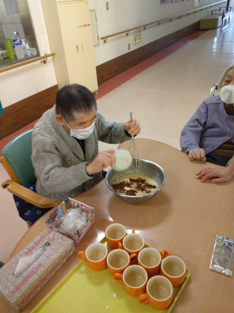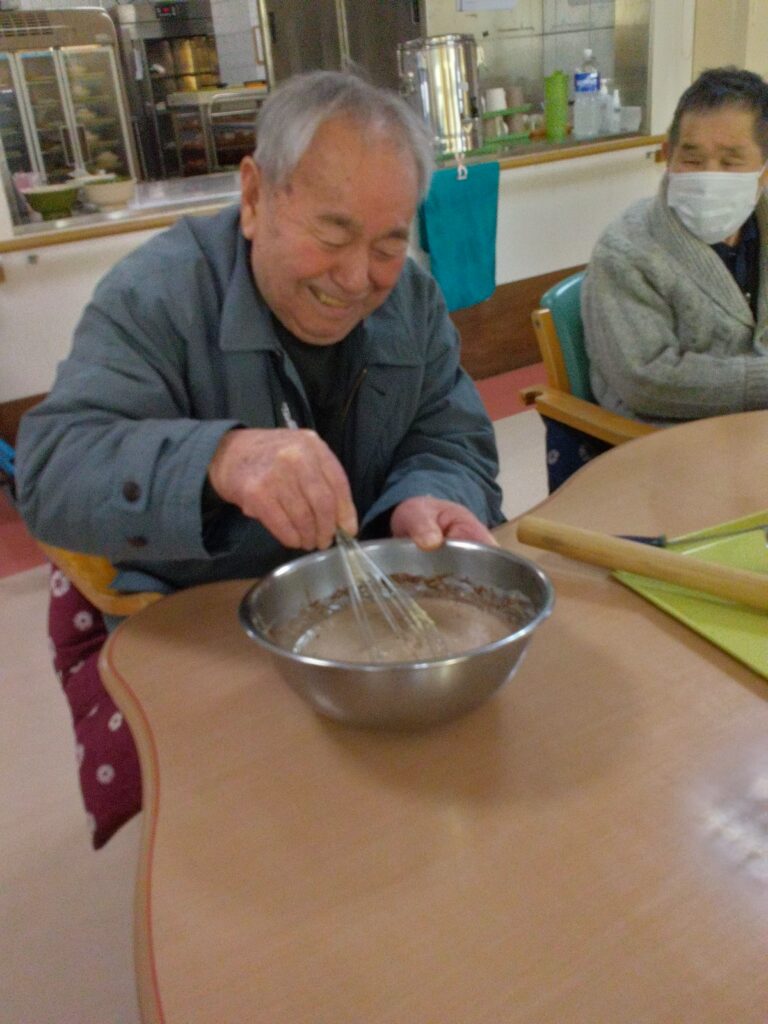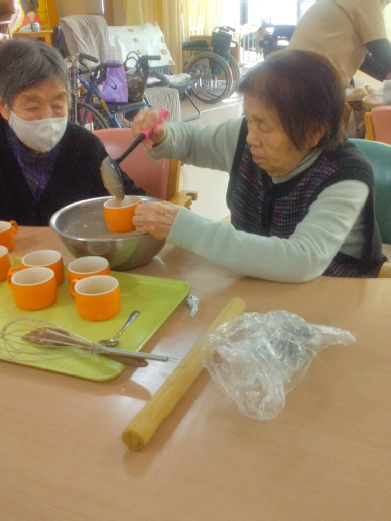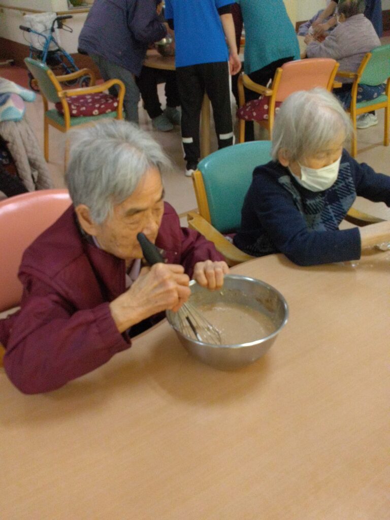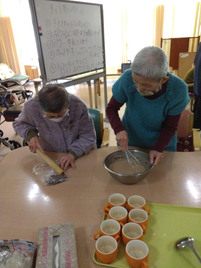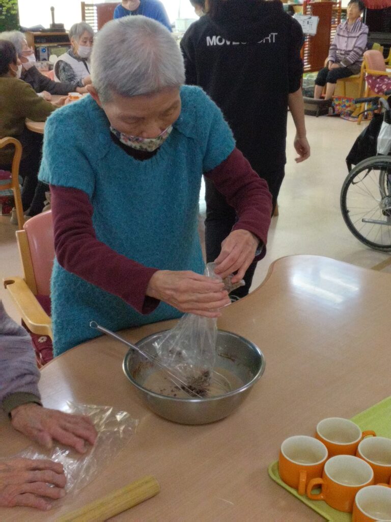 材料を混ぜる工程では「家でよく蒸しパン作ったわ」「甘い匂いするなぁ( ^)o(^ )」と昔を思い出され、賑やかに会話をされながら作業をされていました!