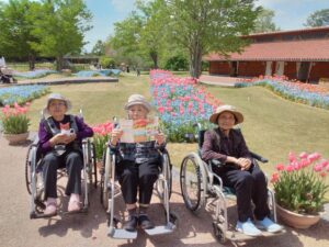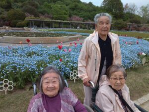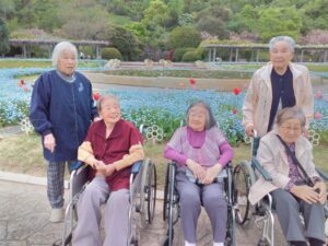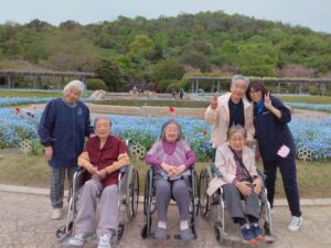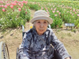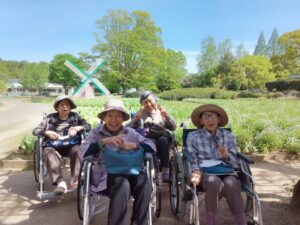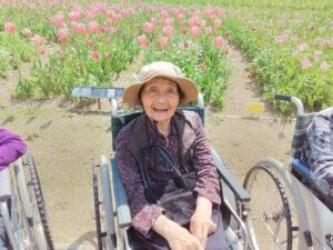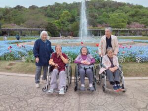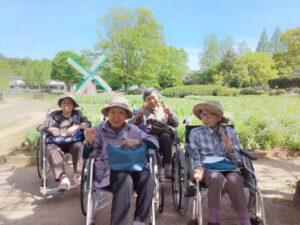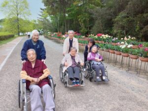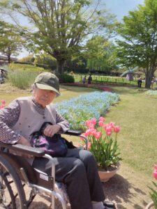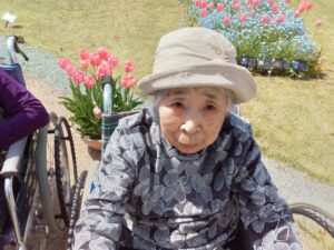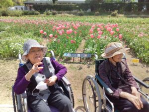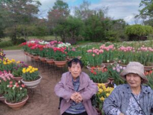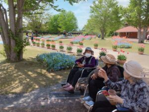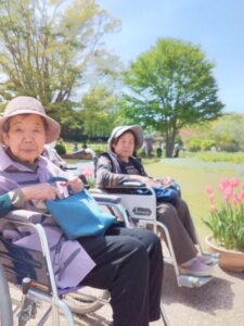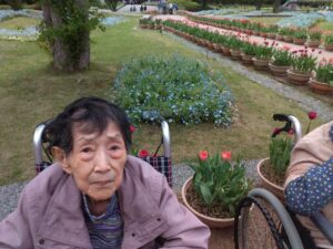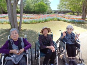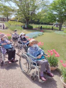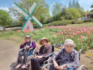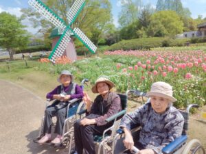 まず入園してすぐに、色とりどりのチューリップがお出迎えしてくれました♪「わぁ~、あれ見てー!」「いろんな色あるなぁ!(^^)!」「あっちもきれいで!行ってみよう(^^)/」と皆さん目をキラキラさせながら眺めておられましたよ( ^)o(^ )