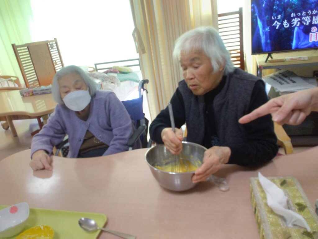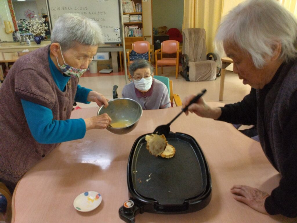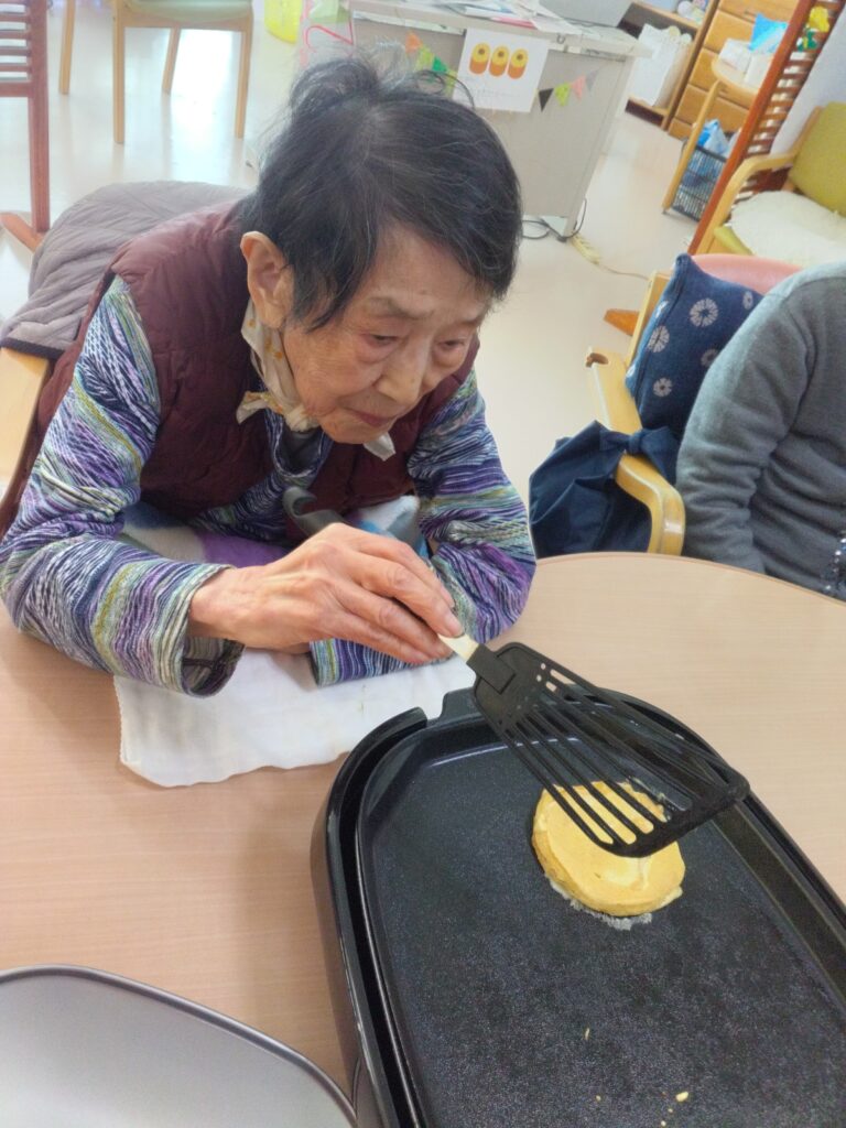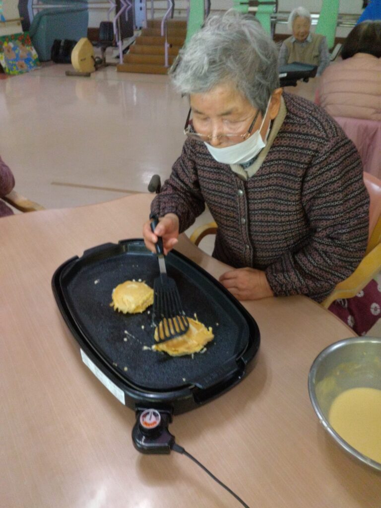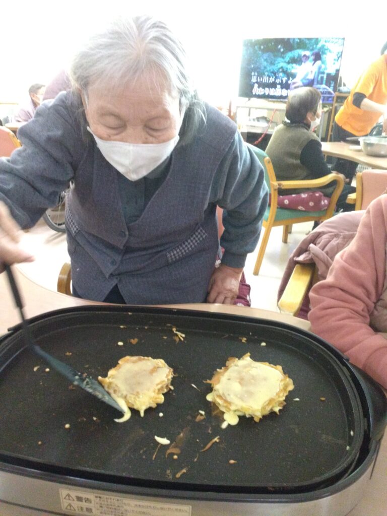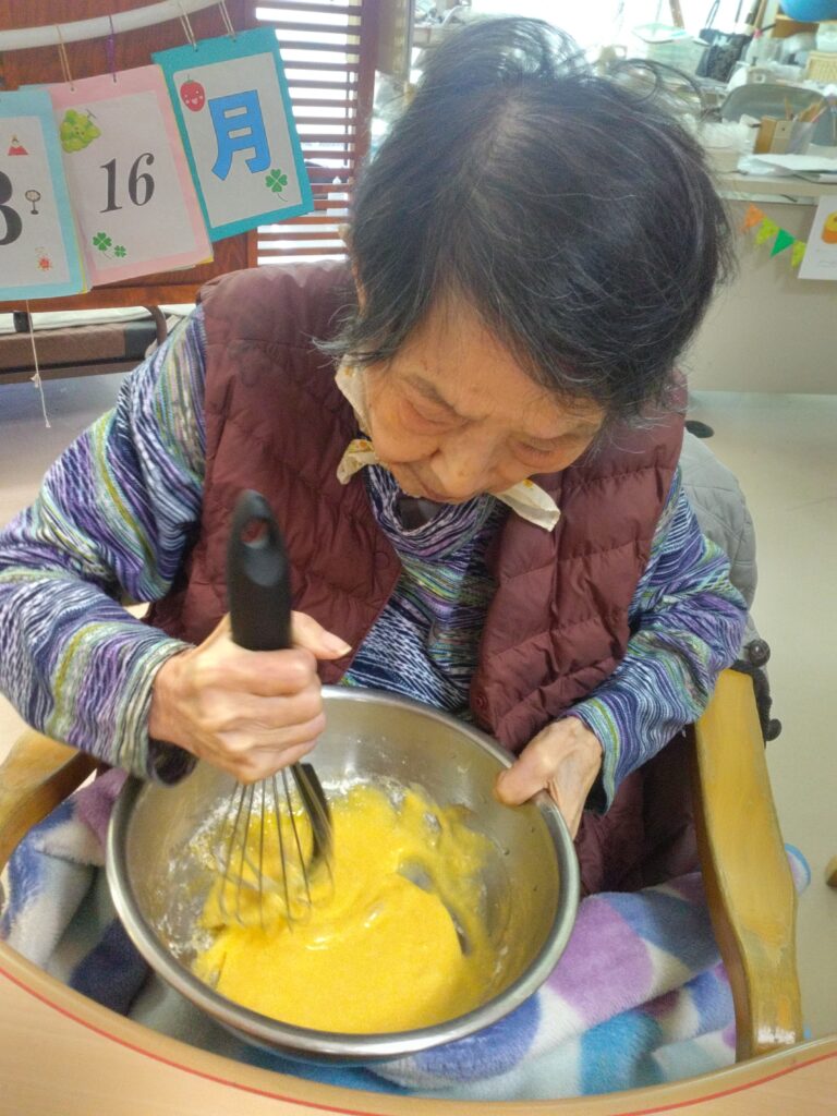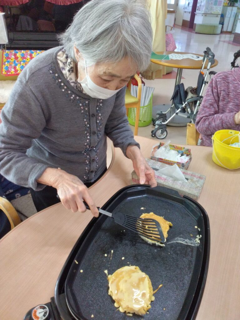 本日はホワイトデーの行事を開催いたしました!!以前よりやってみたかったバームクーヘンをホットプレートを使って作ってみました。ゆっくりじっくり一枚ずつ層を増やしていく作業に皆さんまだかな、まだかなと見守られながら焼き上がりを待っておられました。