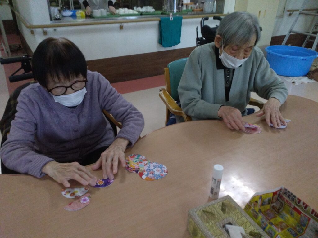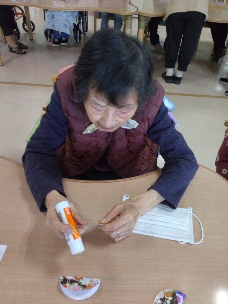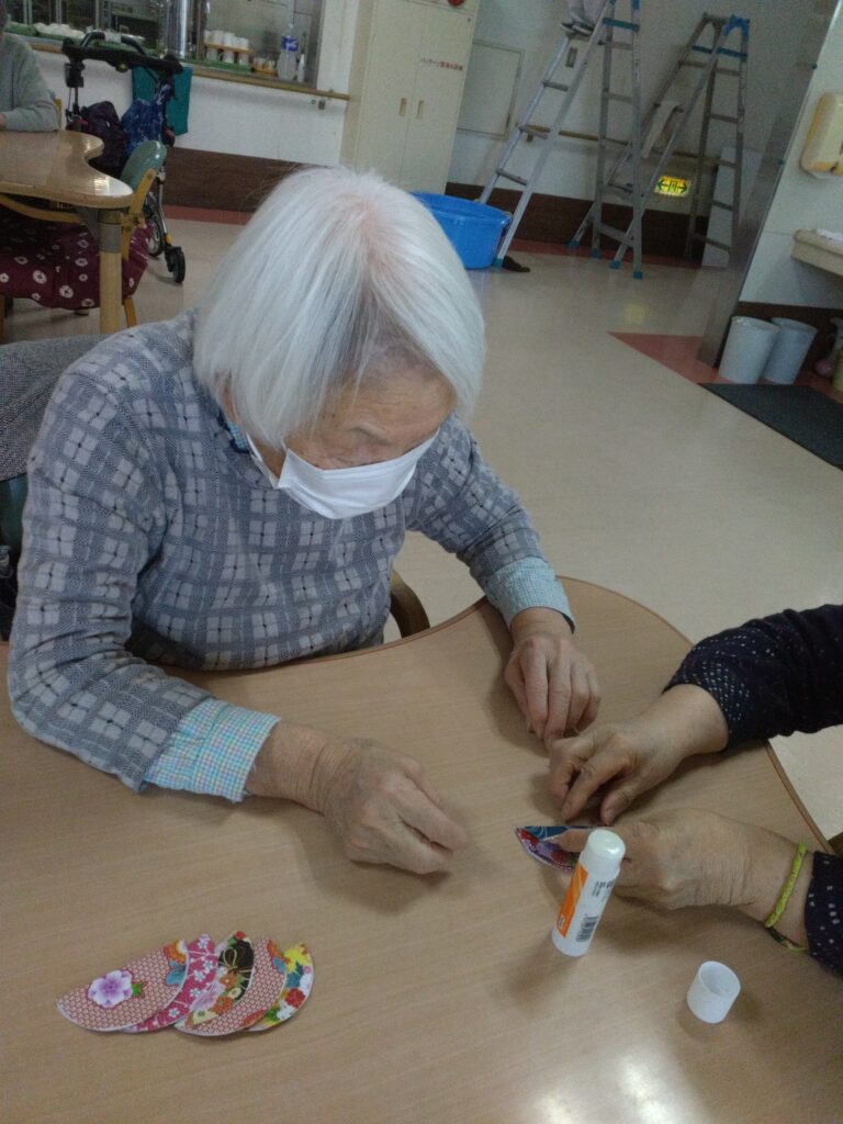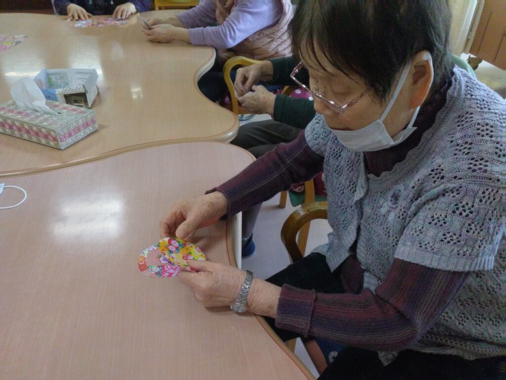 ぼたもち作りと一緒に和紙の柄の小物作りを今回は企画しました。小物作りは細やかな工程があり、少し難しいと感じる方もおられましたが、お一人ずつ一緒に作らせていただきました。