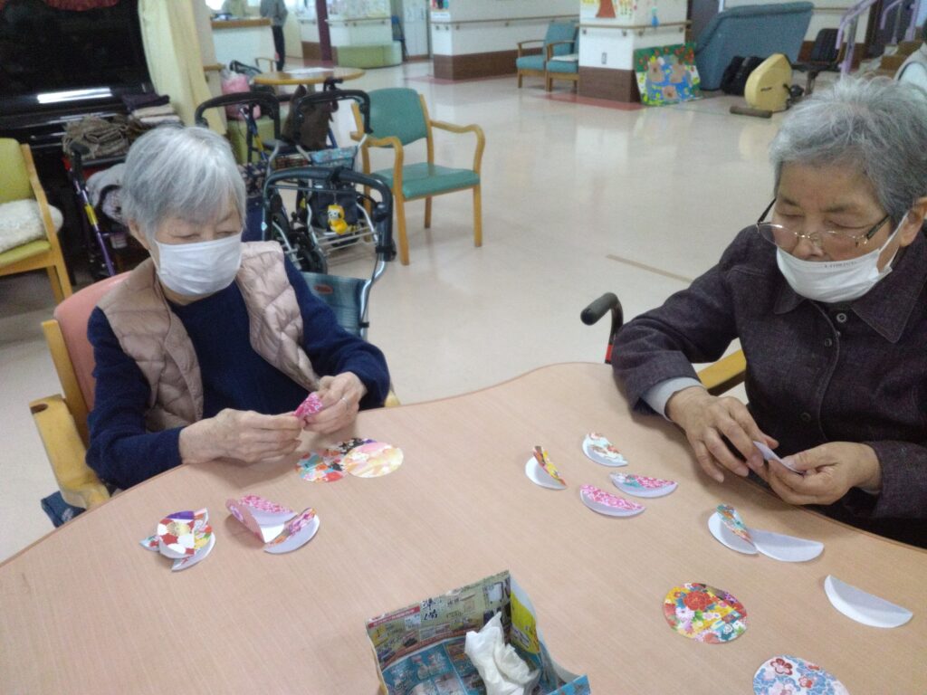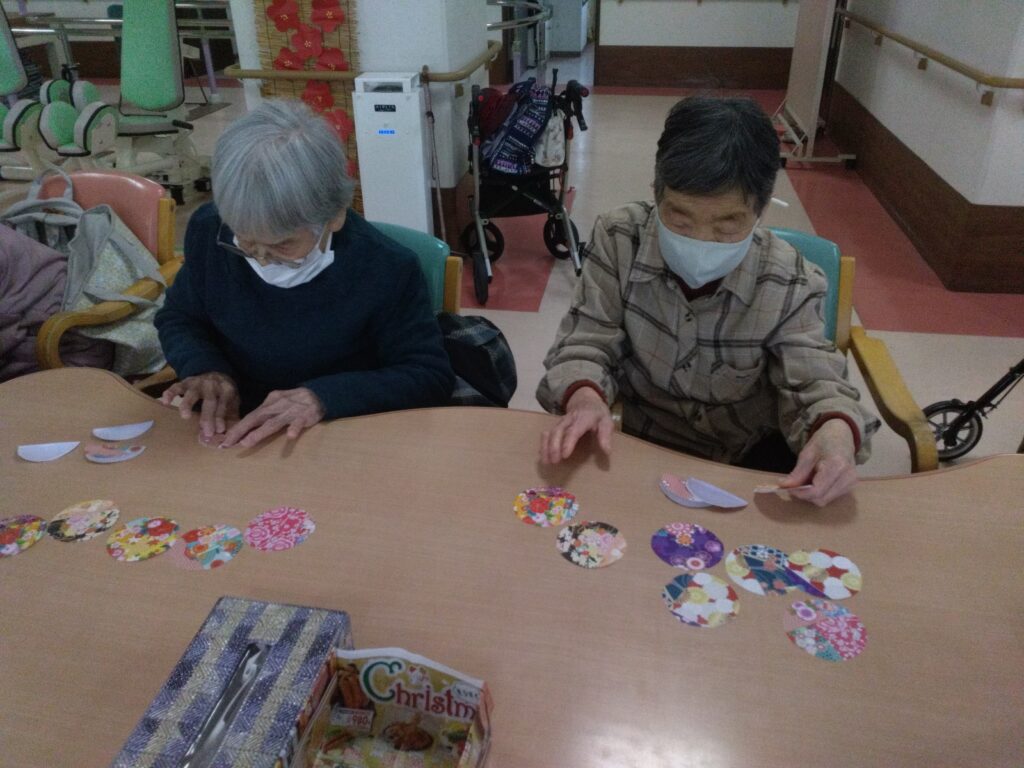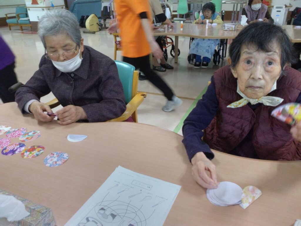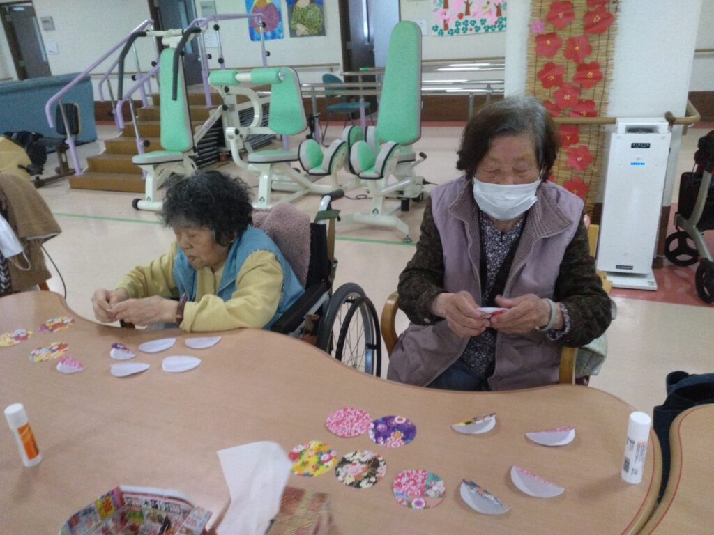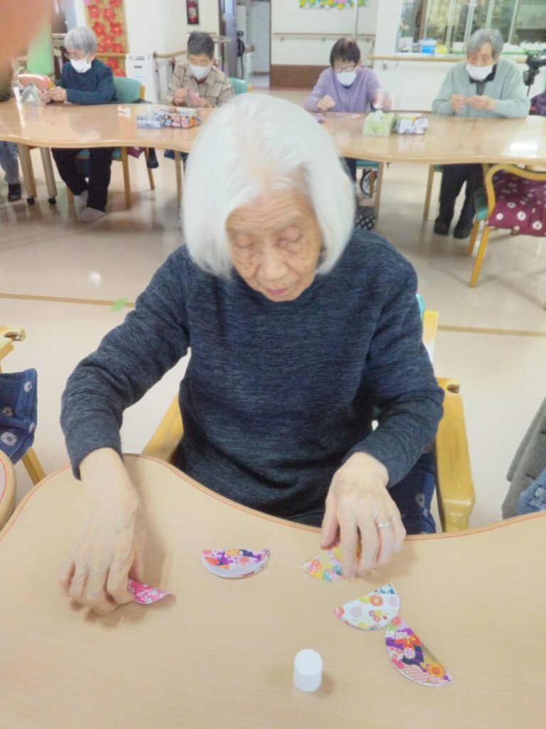 ぼたもち作りと一緒に和紙の柄の小物作りを今回は企画しました。小物作りは細やかな工程があり、少し難しいと感じる方もおられましたが、お一人ずつ一緒に作らせていただきました。