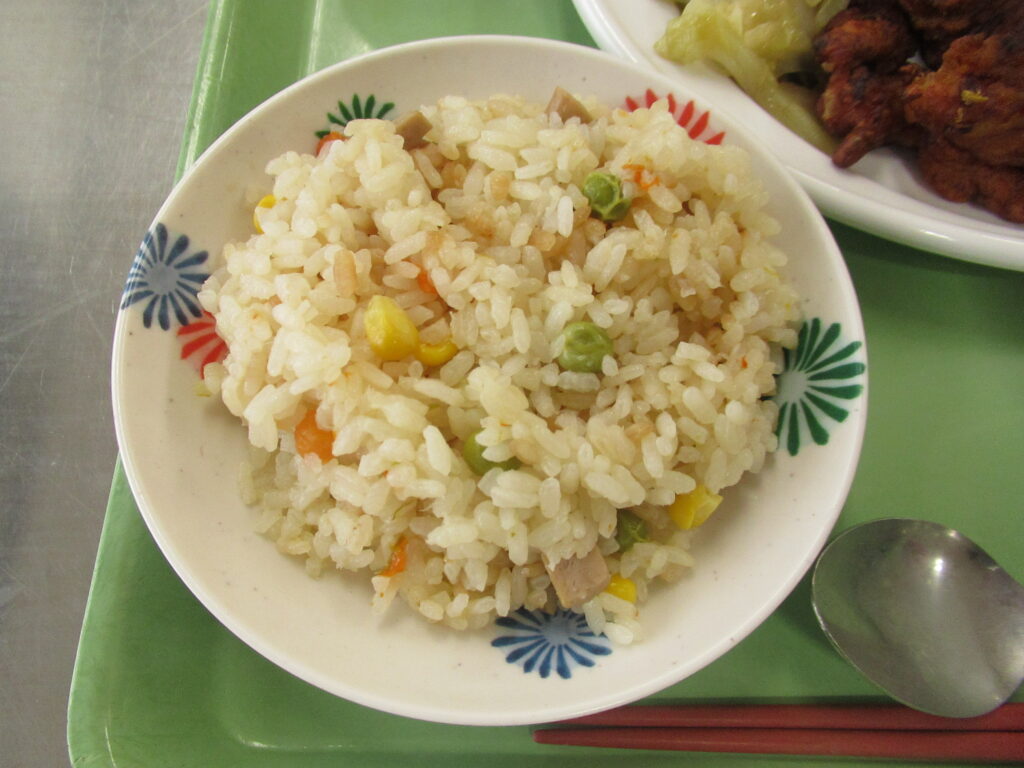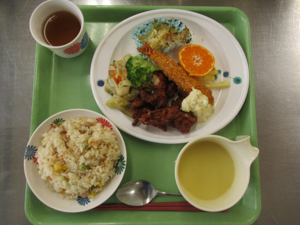 ピラフや唐揚げ、エビフライにグラタン、スープなど豪華な昼食に