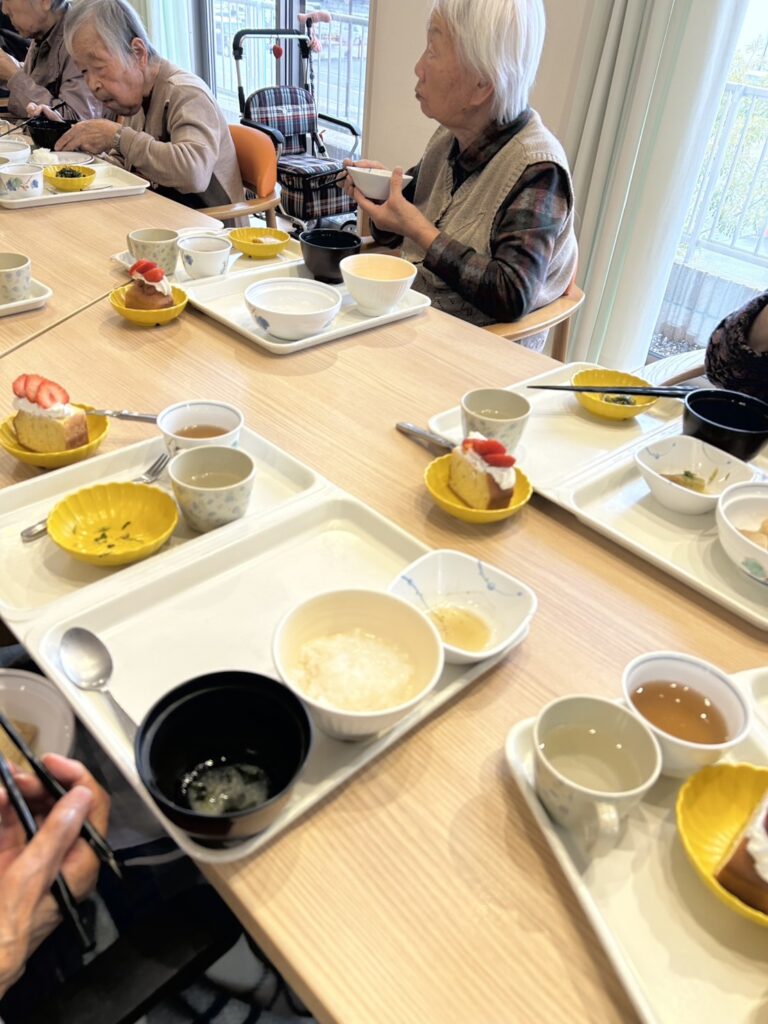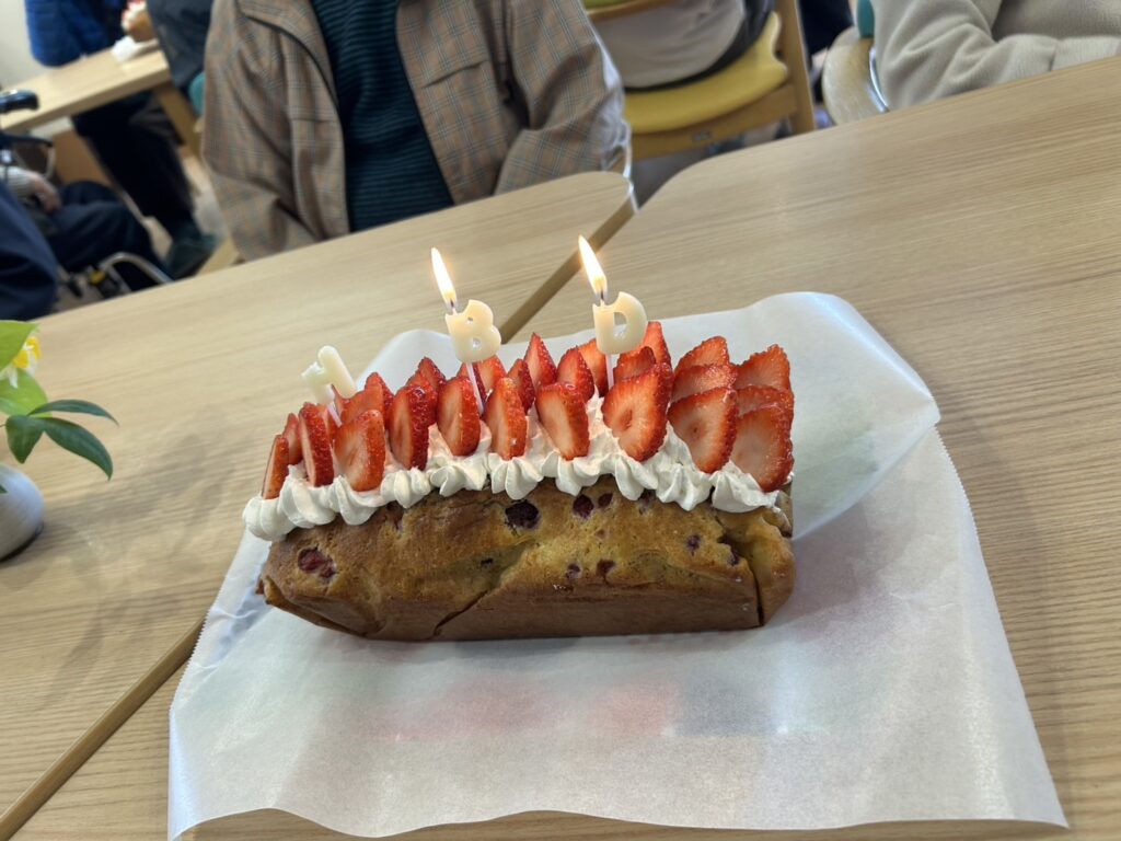 皆様で食堂に集い、職員手作りの「イチゴのパウンドケーキ🍓」でお祝いをしました🎂